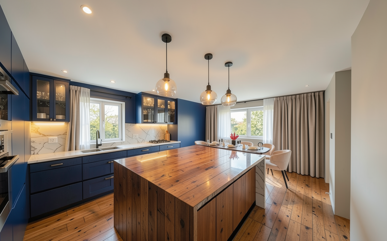 make the island a lighter timber that is open underneath with shelves etc the worktop should match the white kitchen worktop