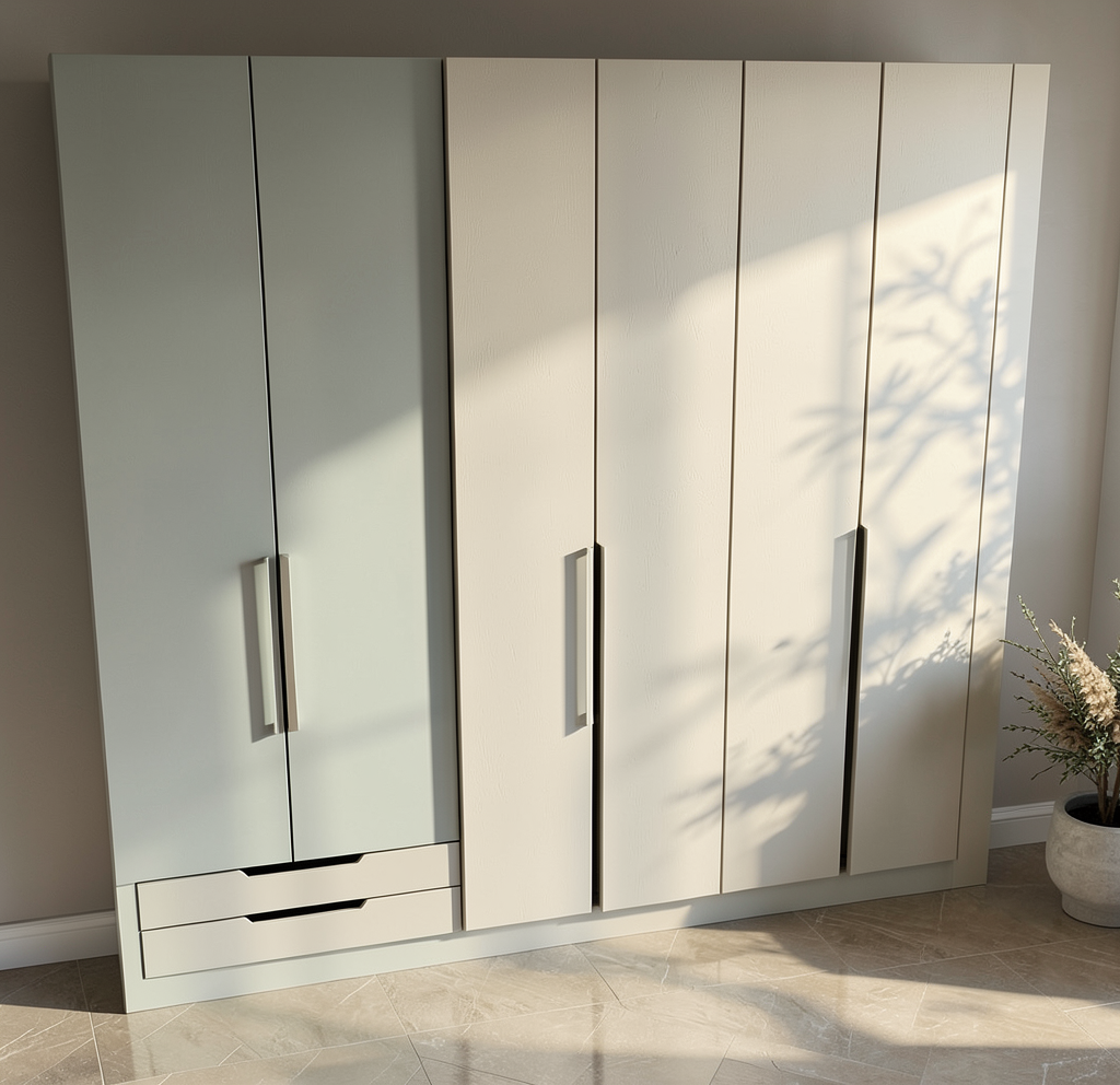 convert this floor plan into a realistic isometric 3d view of a full house show the space from an elevated angle with furniture walls and details visible do not add any rooms or items that are not shown on image both bathrooms have a walk in neo angle shower linen cabinet single sink vanity and a toilet garage has a single double wide overhead garage door in the front and a single wide overhead garage door on the on the left wall in garage on right wall that is a refrigerator and a 6 base cabinet with a large tv on wall above use the same furniture as shows on the plan do not change the orientation of the floorplan