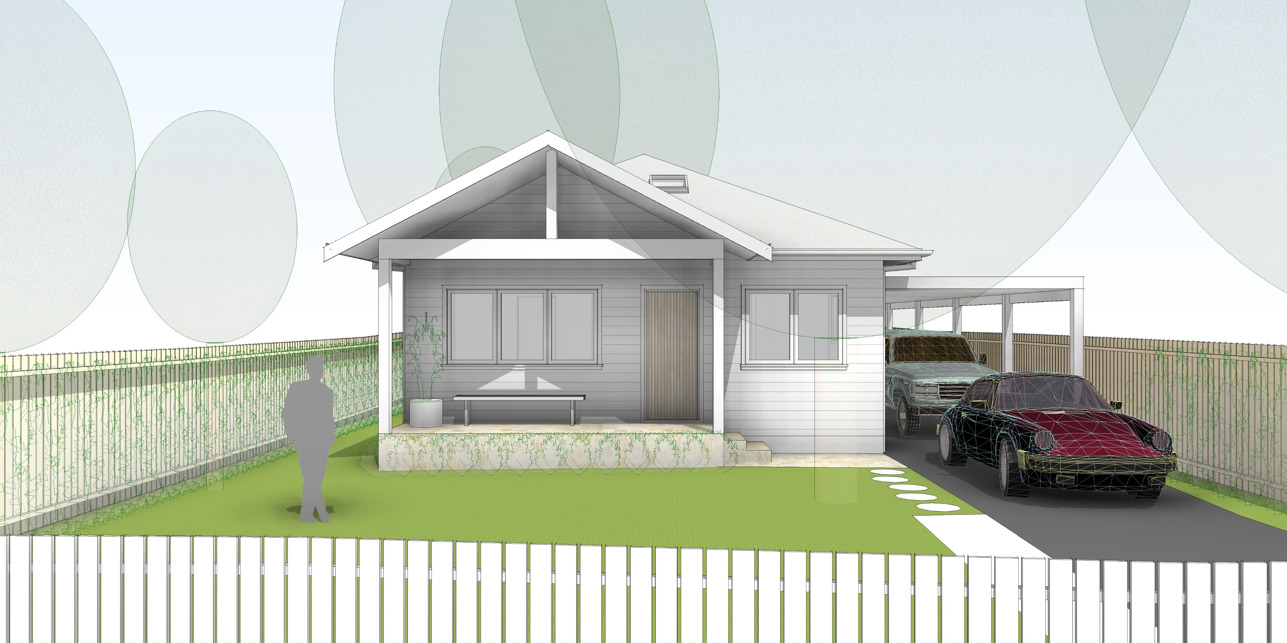 render a photorealistic 3d perspective of this house near sydney reference the current material style and enhance them white metal roof linea fibre cement cladding and sandstone walls keep model geometry the same windows doors roof walls garage door pavement driveway make a lush vegetation that looks native to australia do not change the view only enhance the current materials and make the landscape nicer vegetation detailed textures in the grass and glass reflections and a vibrant clear sky with light atmospheric depth render in hyper realistic architectural visualization quality 8k resolution