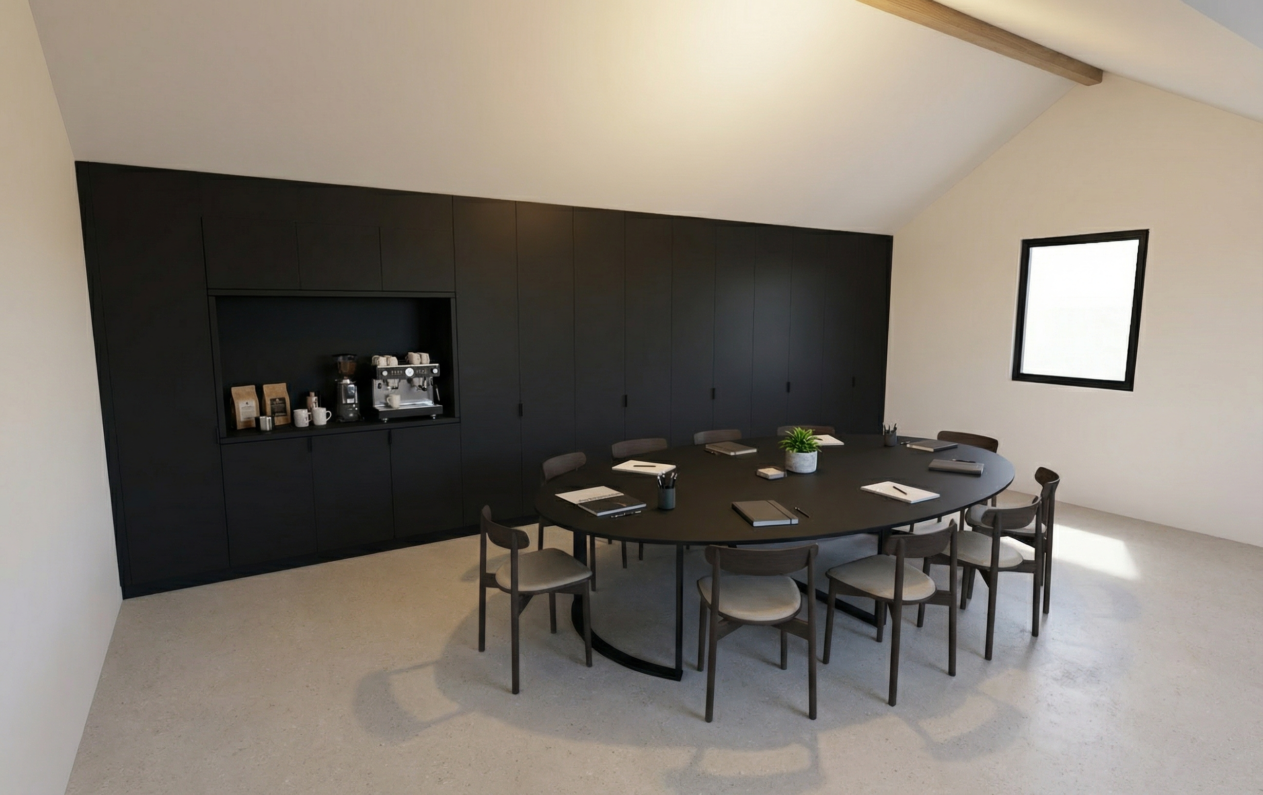 arreda un salotto moderno attraverso le finestre si deve vedere il terrazzo con i vasconi in corten arricchiti da piante e due persone che parlano