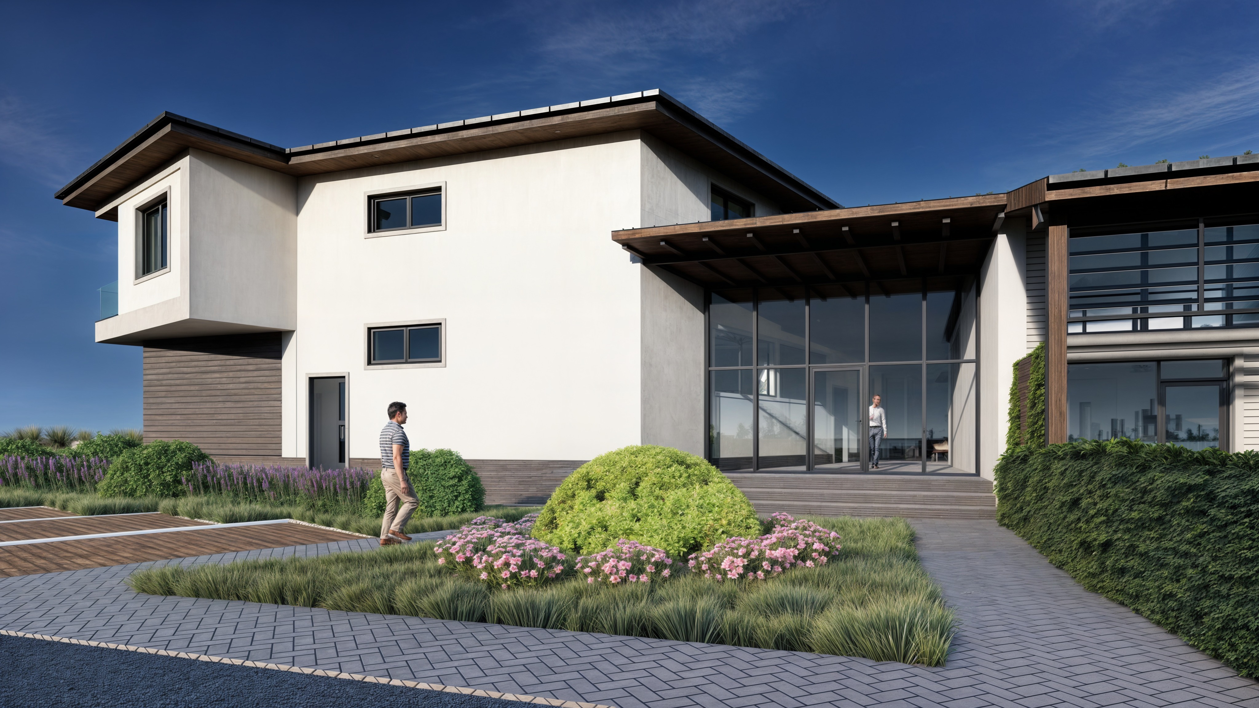 a modern residential building entrance featuring clean white plaster facades combined with dark rich toned wooden cladding the architecture is elegant and contemporary with simple volumes a generous glass entrance and a covered canopy with exposed wooden structure the wood elements have a deep warm tone creating a strong contrast with the light facade and enhancing the premium aesthetic the scene is illuminated with warm soft natural light creating a cozy and inviting atmosphere the lighting has a subtle golden hue with soft shadows and gentle highlights that enhance materials and depth the pavement and driveway appear slightly wet with delicate reflections adding realism and a refined visual quality the landscaping includes ornamental grasses flowering plants and trimmed shrubs arranged in a natural and well balanced composition a person walking toward the entrance adds scale and life while another figure inside the glazed area enhances the sense of transparency and depth the overall mood is cozy modern and high end with a photorealistic architectural visualization warm ambiance and a calm welcoming residential environment