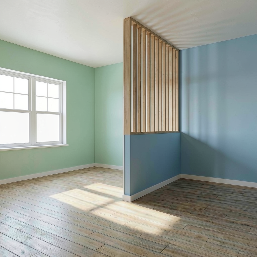 maintain all model geometry this should feel like a high end primary bedroom suite there should be a contemporary style ceiling light the casework door and trim should be painted in a semi gloss finish with the color from the original image decorate the room as a modern bedroom with modern window treatments a contemporary ottoman in front of the bed the carpet should be plush and look expensive the wainscotting should appear as painted framed casework in a semi gloss finish add a couple of contemporary sconces above the wainscotting and modern wall art the room should feel bright and airy