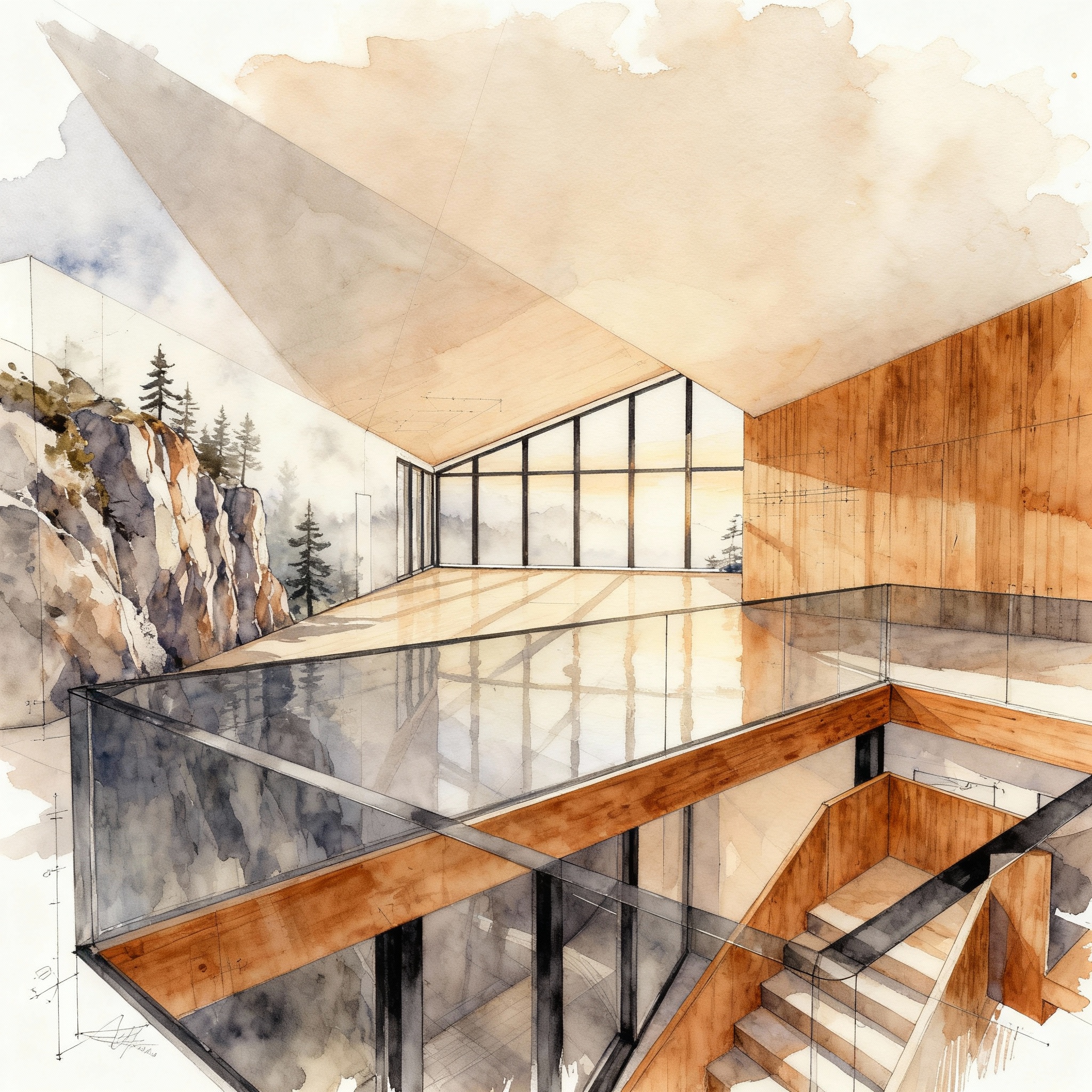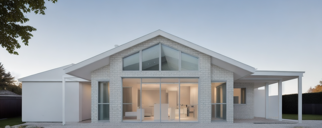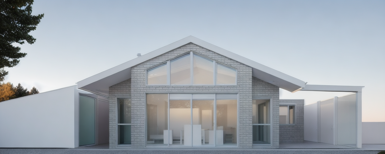 render a modern sleek two story building with a minimalist design the structure features a white brick facade contrasted by charcoal black accents creating a sharp contemporary look large glass windows on both upper floors reflect the serene surroundings bathing the interior in natural light the balconies are bordered by elegant black railings the main entrance consists of understated dark stained cedar doors with subtle highlights the lower floor has dark stained cedar garage doors the atmosphere is calm yet sophisticated illuminated by soft ambient lighting against a clear evening sky integrate lush greenery around the entrance and a gentle pathway leading up to the building enhancing the inviting ambiance