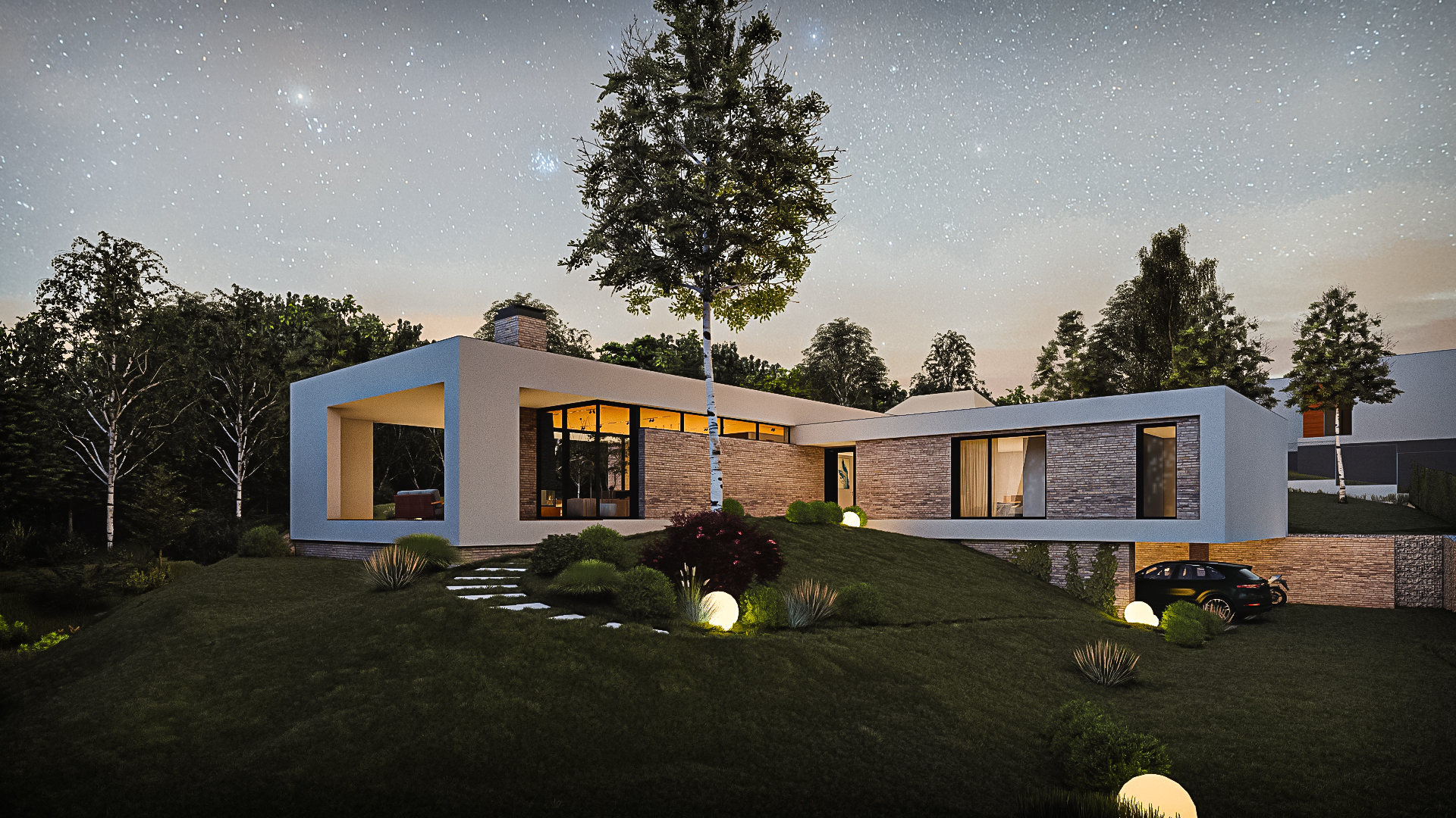 late evening important preserve the existing geometry and the existing context exactly as provided do not modify alter reinterpret add remove scale or reshape any geometry do not change the site surroundings street layout neighboring buildings vegetation or context elements do not modify geometry scale proportions buildings road layout sidewalks or surrounding context in any way photorealistic architectural rendering clean and balanced contrast calm cinematic mood style contemporary european residential architecture minimalist premium understated oo not put a road in image