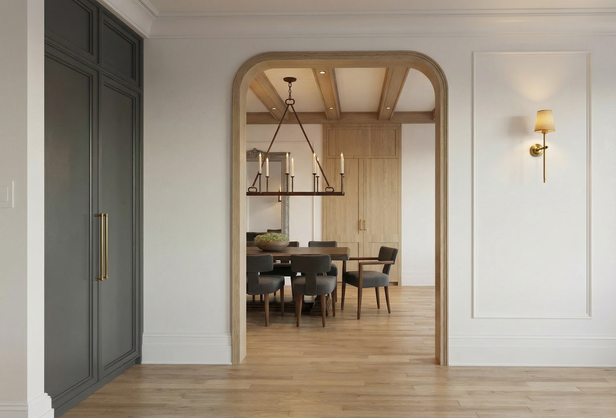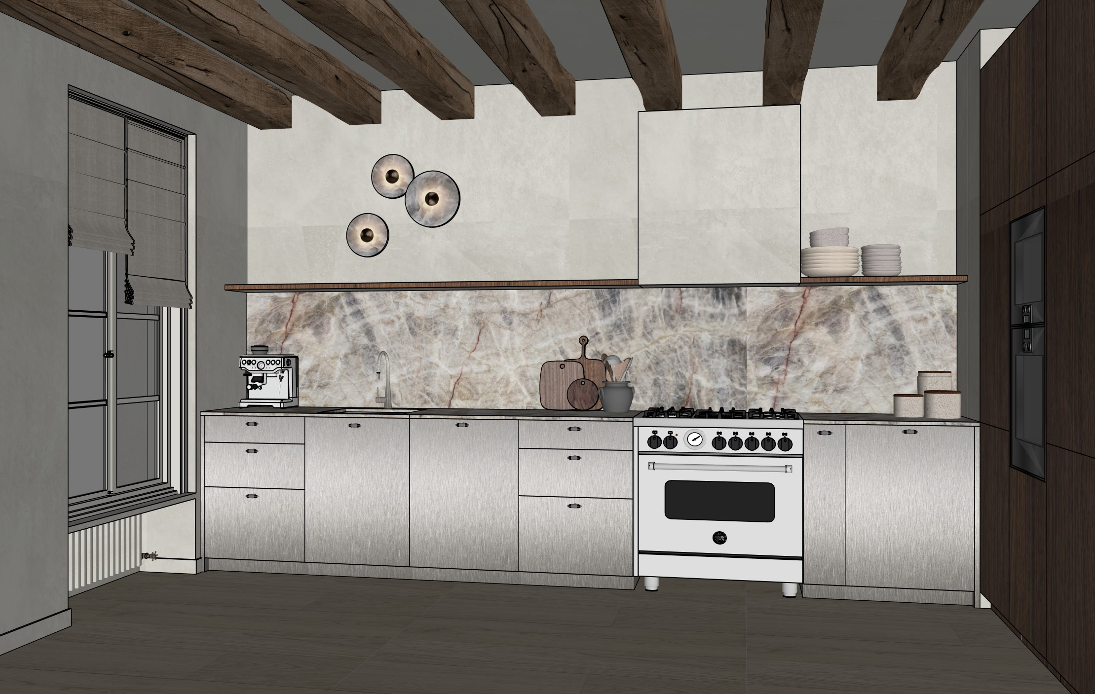 the walls should be lightly plastered the stone is more grey the appartment is in paris on the 3rd floor the stove is a lacanche range in stainless steel the cabinets are in stainless steel but not so shiny the colors of the room should be more beige and a little brighter the floor is in ancient wood the range hood is the same color as the walls and is lightly plastered add some subtle lights under the shelf style the space like colin king make the walls a little more plastered and authentic the lights on the wall are in alabaster and are the median sconce from apparatus studio put a few discreet spots between the wooden beams it is a parisian building