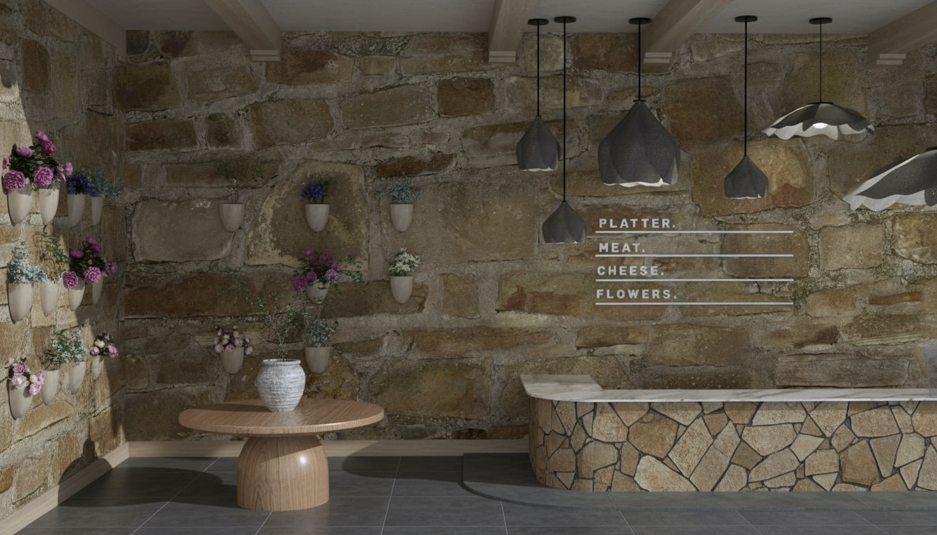 the sliding wooden screens located on the upper story slides bypassing open all the way to the right to stack one behind the other the front wall and planter are concrete and not stone all sliding panels are vertical wood louvers completely open