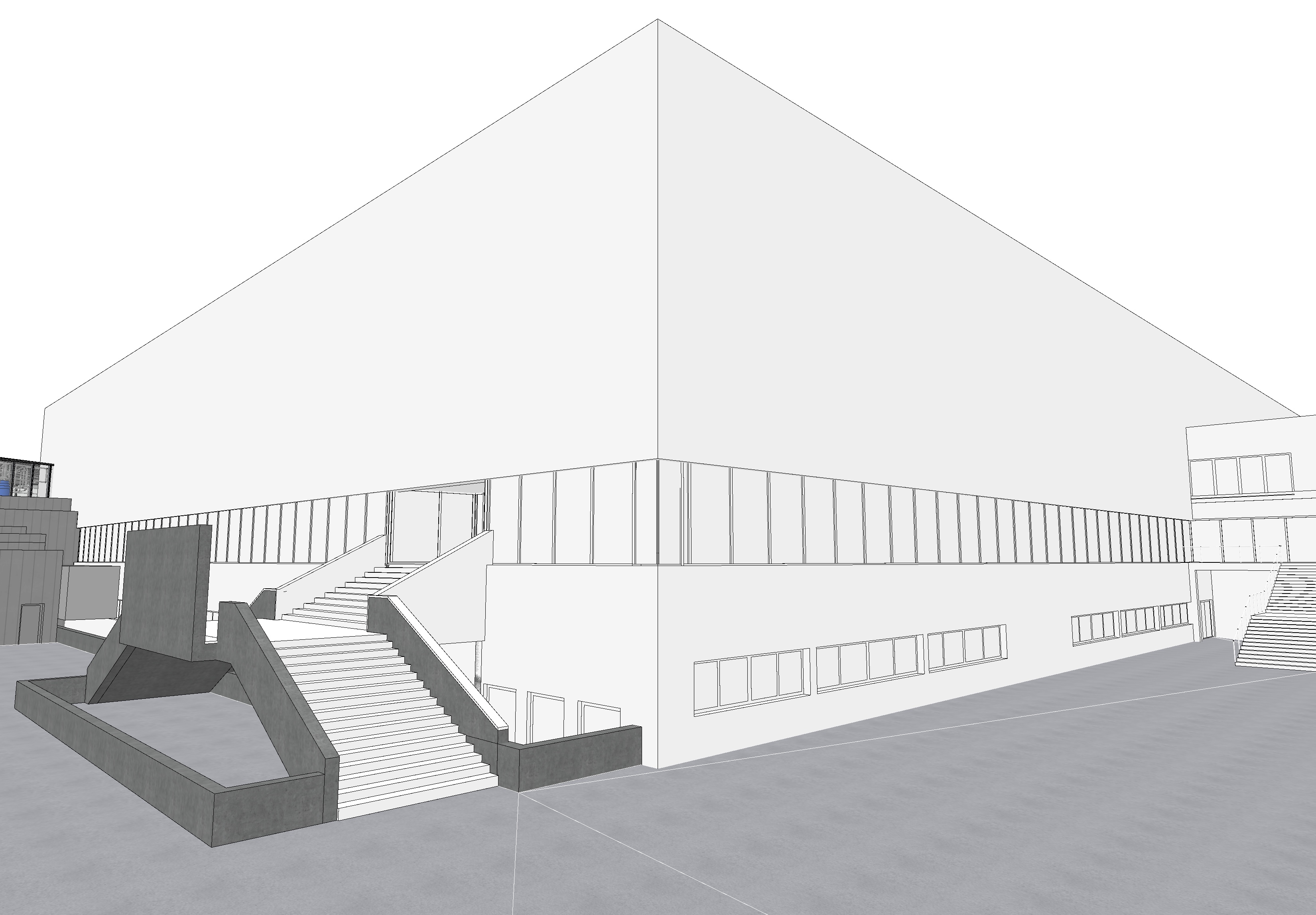 exterior shot a modern architectural structure with clean lines and minimalist design featuring large windows reflecting the sky the building s facade is painted in a sleek white contrasted by dark concrete elements the staircases and surrounding pathways have a smooth light gray finish the atmosphere is bright and contemporary with natural sunlight casting soft shadows creating a sense of openness and tranquility the background sky is clear blue adding to the fresh and inviting ambiance