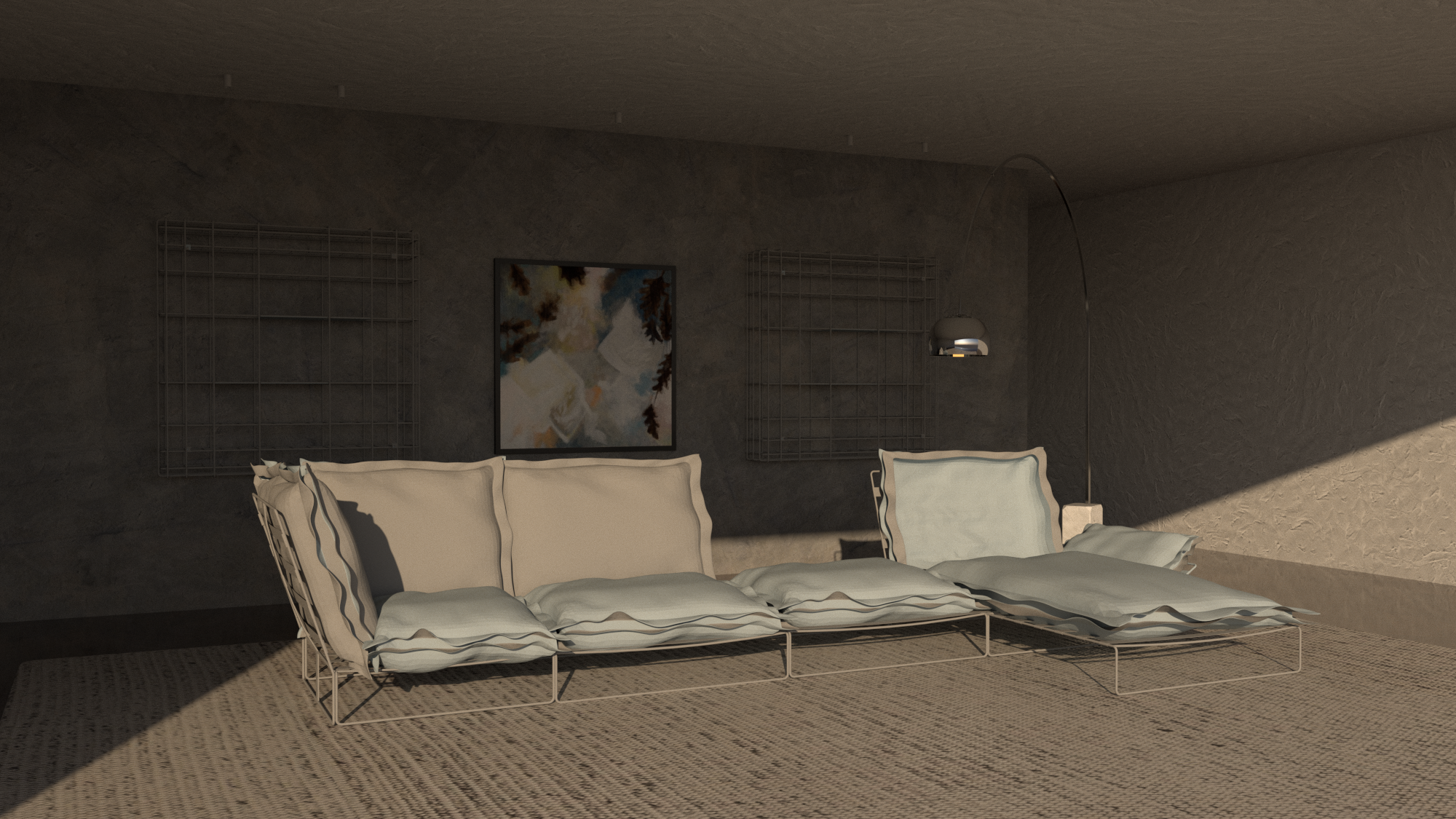 add light to the scene in the floor lamp and the spotlights on the ceiling the shelves on the back wall should be decorated in a modern minimalist style with vases and cool books the couch should be the star of the scene the frame is chrome the fabric of the cushions is a white boucle fabric the zippers between the fringes should be in a dark green