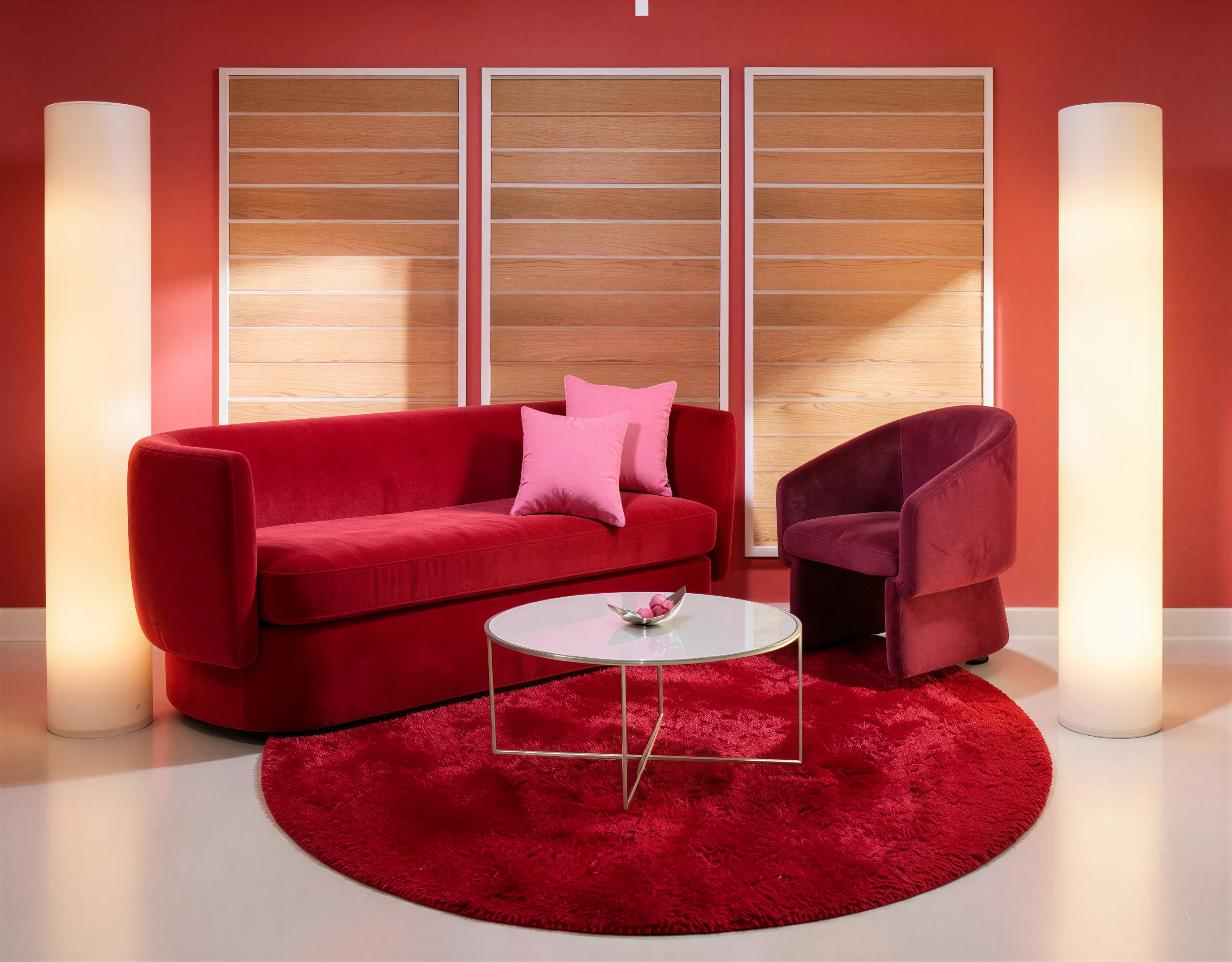 make the sofa and chair the same color red and remove the wood slats from the wall