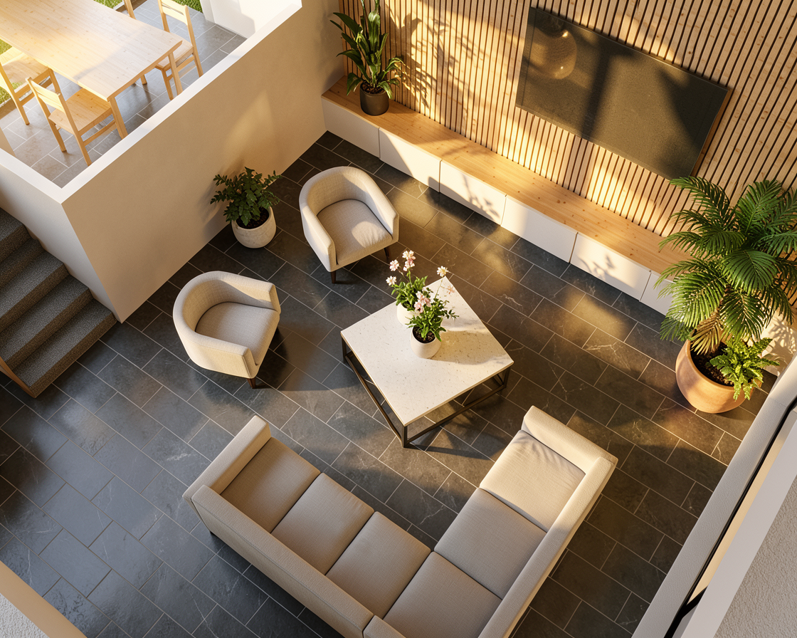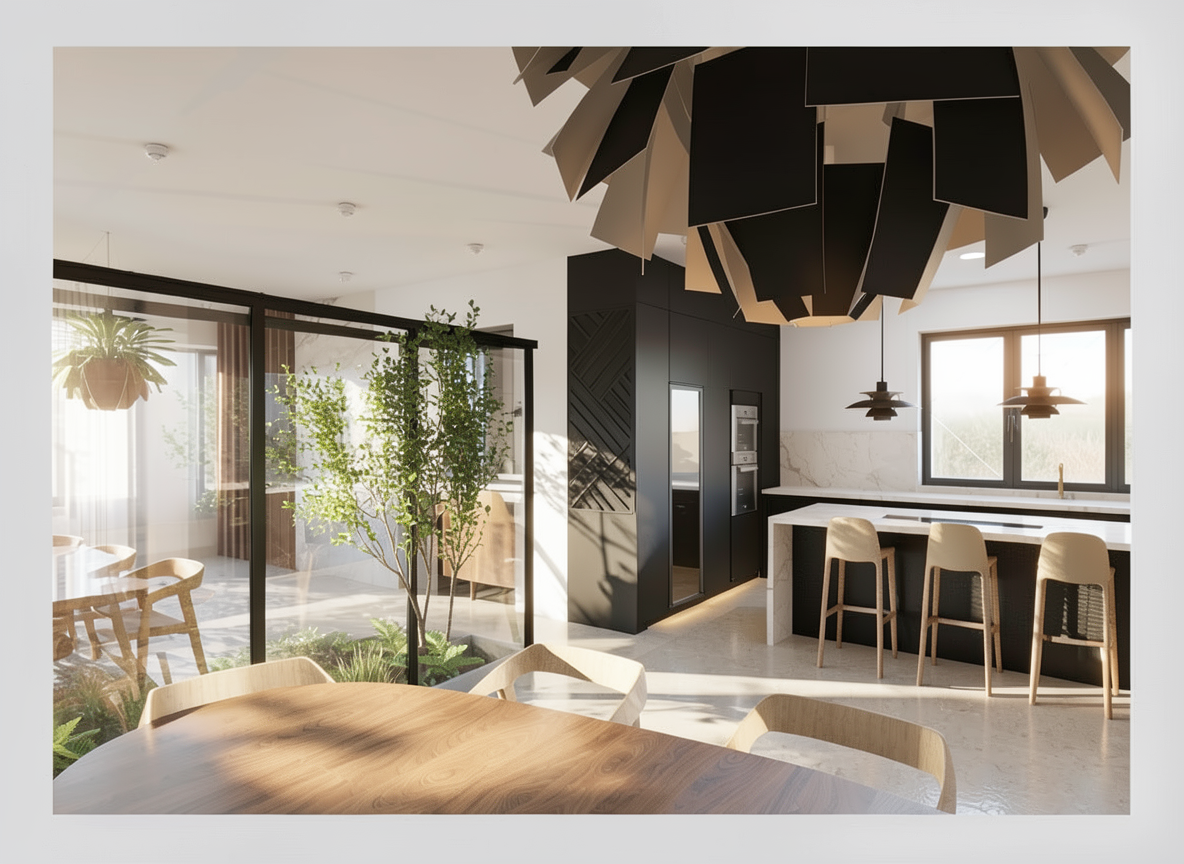 photorealistic architectural exterior visualization absolute fixed camerapoint and unchanged geometry and proportions matching the provided input image exactly high end modern dutch barnhouse schuurwoning the large gabled volume features weathered vertical cedar wood siding and a central gabled flagstone chimney rugged slate grey dry stack texture the massive smoky deep tinted reflective glass facade with its intricate 30mm matte black mullions grids is preserved perfectly the right flagstone structure is constructed of dry stack flagstone masonry the gem leerd multi toned natural slate roof is retained with the two flush integrated velux roof windows black frames all glass across all facades is deeply smoke tinted and highly reflective mirroring the surrounding lush nature and sky rendering the interiors completely invisible and pitch black add a distinct 50cm tall dark masonry plinth smetrand below all ground floor walls environment and landscaping integrated around the fixed camera the house is situated on a luxurious rural brabant estate in the far background behind the dense row of mature oaks an oak tree lined dirt track is visible with an open sightline over meadows foreground features wild grasses and a distinct native tree cluster the garden features organic curved planting beds with tall wild ornamental grasses and ferns contrasting the architecture the paved terraces are completely empty and clean with zero furniture or decorations to the right side a long gravel driveway with a modern dark electric car parked in the far distance late afternoon golden hour lighting from the left highlighting the deep rugged textures and weathered wood grain hyper detailed pbr textures 8k resolution cinematic lighting architectural photography quality no text from the site plan is rendered