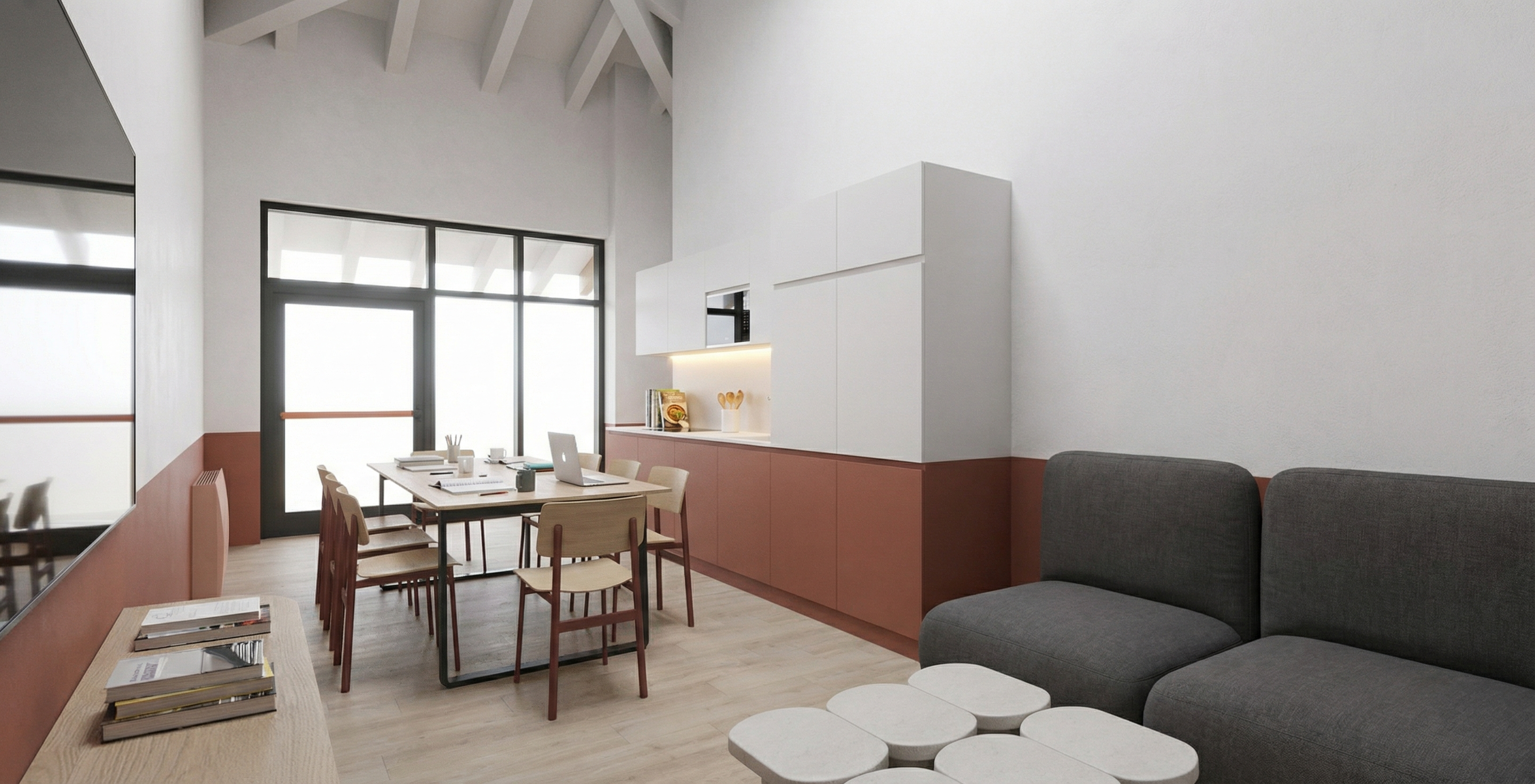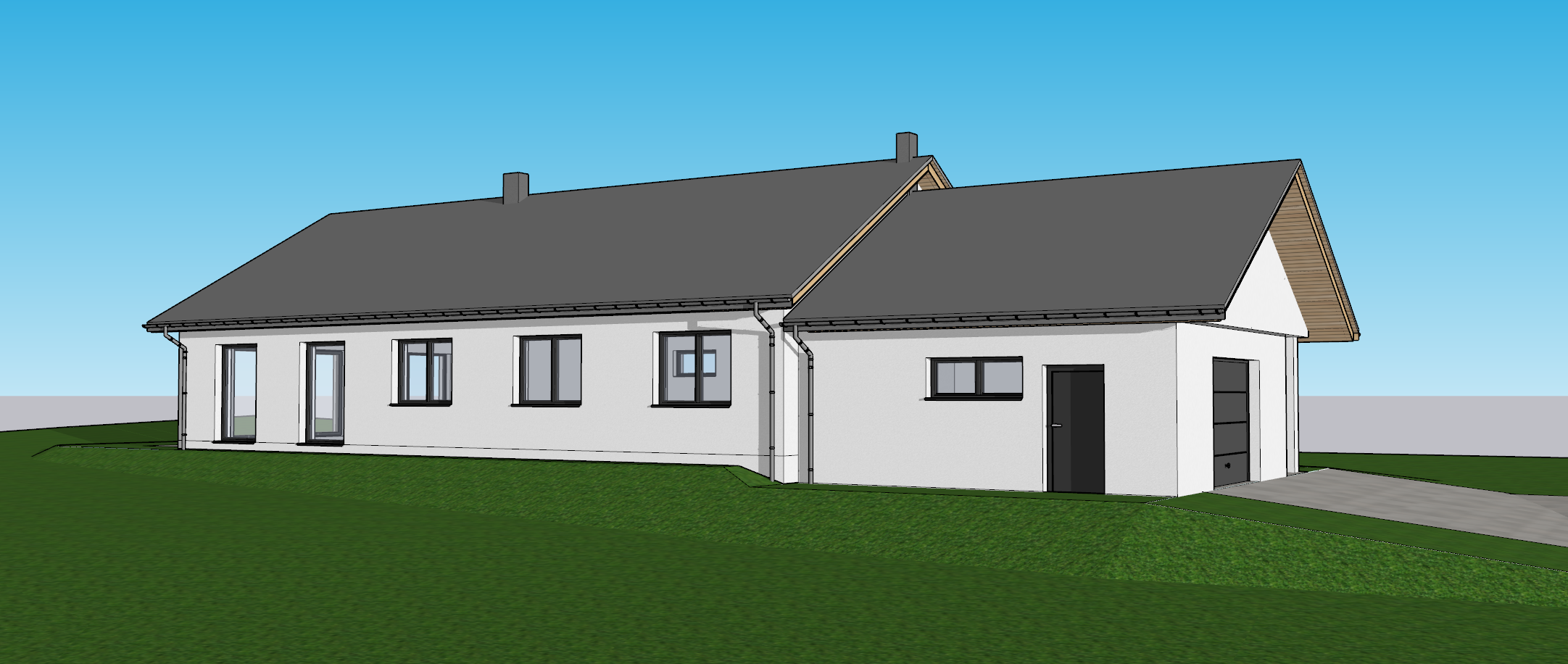 a roof made of flat grey tiles laid in a staggered pattern white plaster on the walls a thin grey horizontal strip on the gable wall anthracite coloured window and door joinery a chimney covered with grey seam sheet metal low bushes around the house a sunny sky a light wood soffit lamps in the soffit curtains on the windows children playing