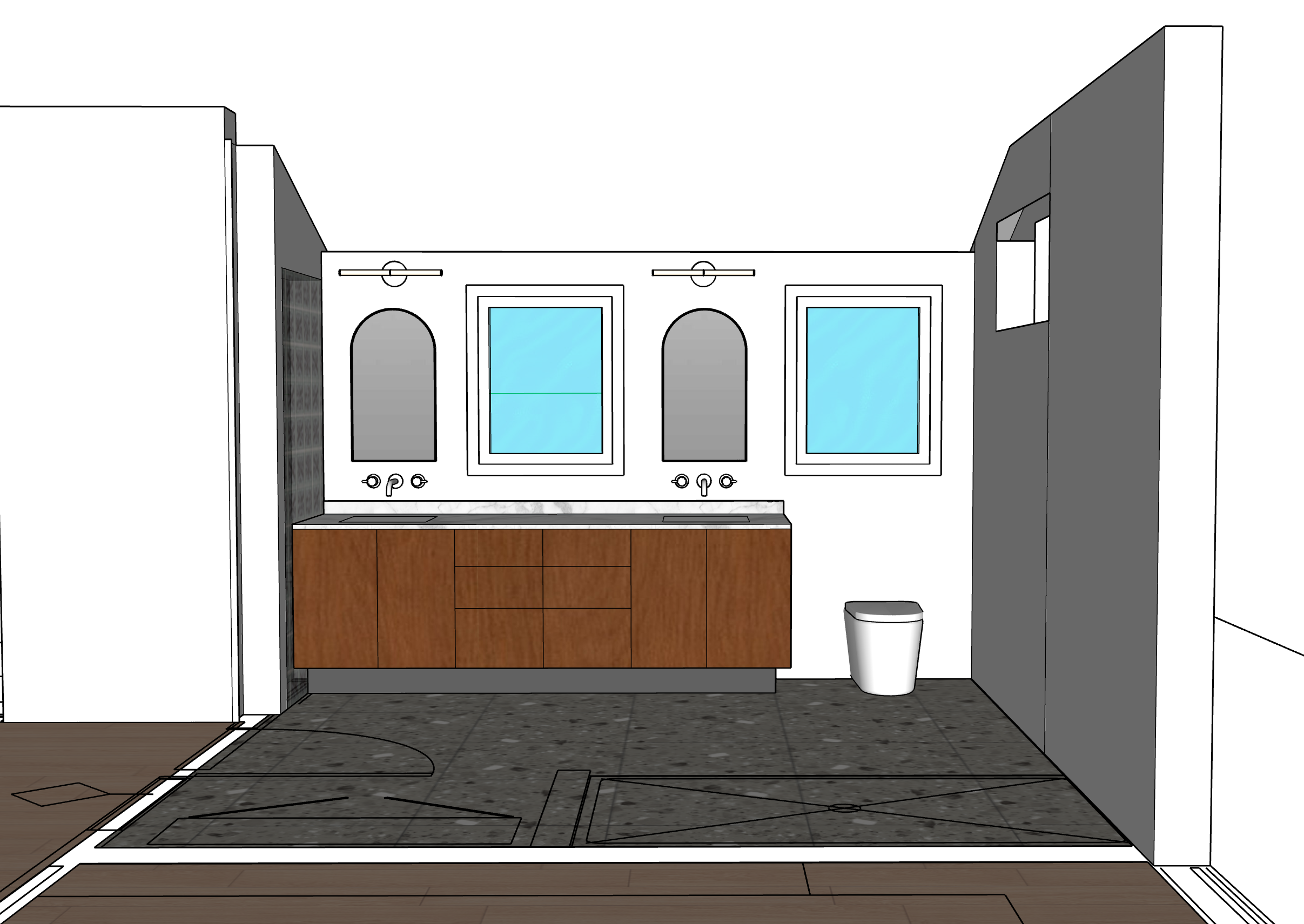 a luxurious and serene bathroom beige tiles and bronze fixtures complemented by a warm travertine stone floor the double vanity is adorned with calacatta viola marble countertops and warm walnut wood cabinets accented by elegant bronze hardware the atmosphere is calm and inviting with abundant natural light filtering through the window casting gentle shadows