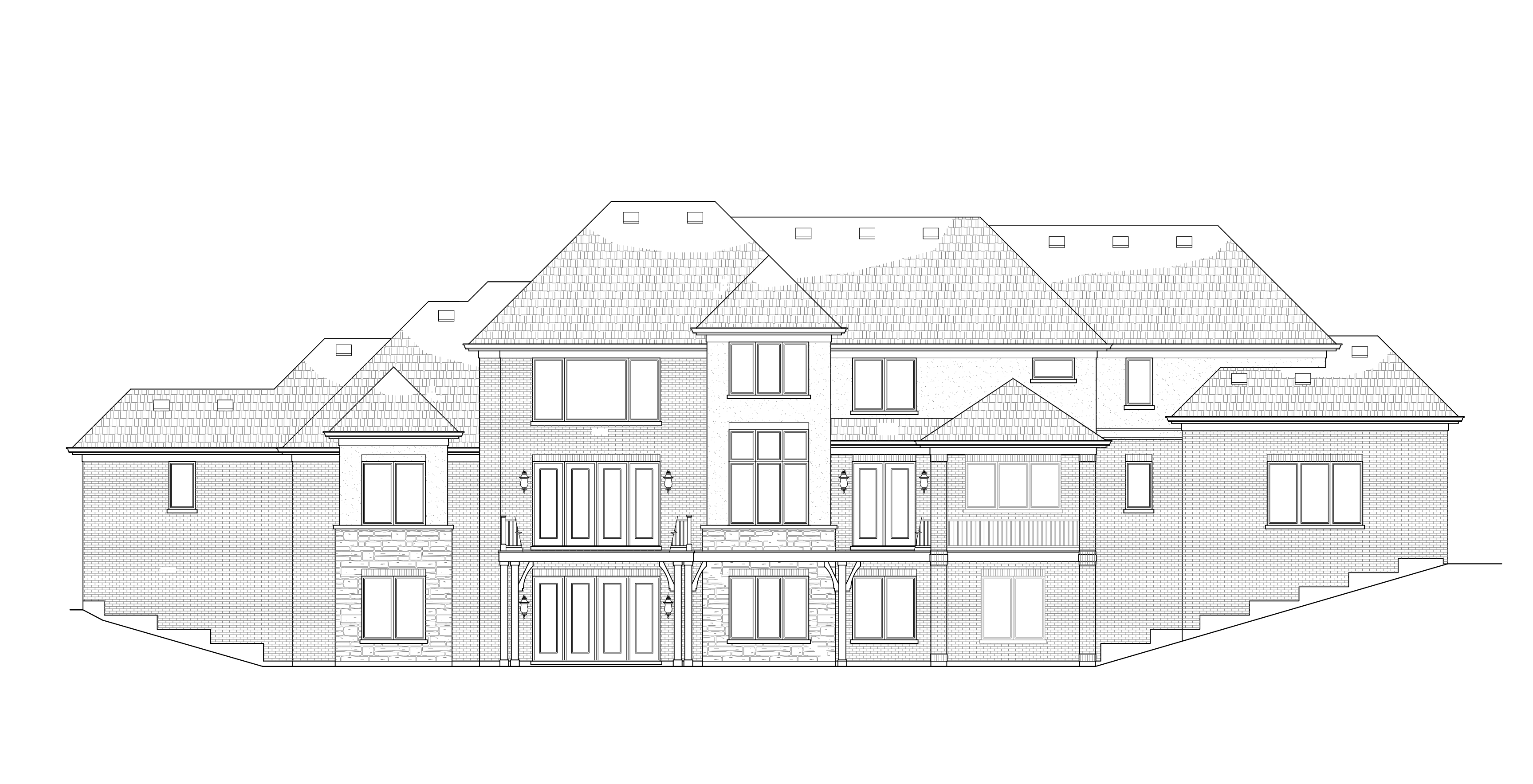 a rear elevation view of an elegant residential building with light beige brick with gray shake shingles on the roof there is light grey stone at the lower center and on the left side of the home there is some light beige stucco in the upper right side of the home set at sunset with clouds in the sky the interior should have glowing white lighting the window frames should be beige with no grills a wood deck with wood railings the landscape should show large trees in the background and sloping grass on the left and right side of the house a few small bushes and flowers in the foreground do not change the angle of view