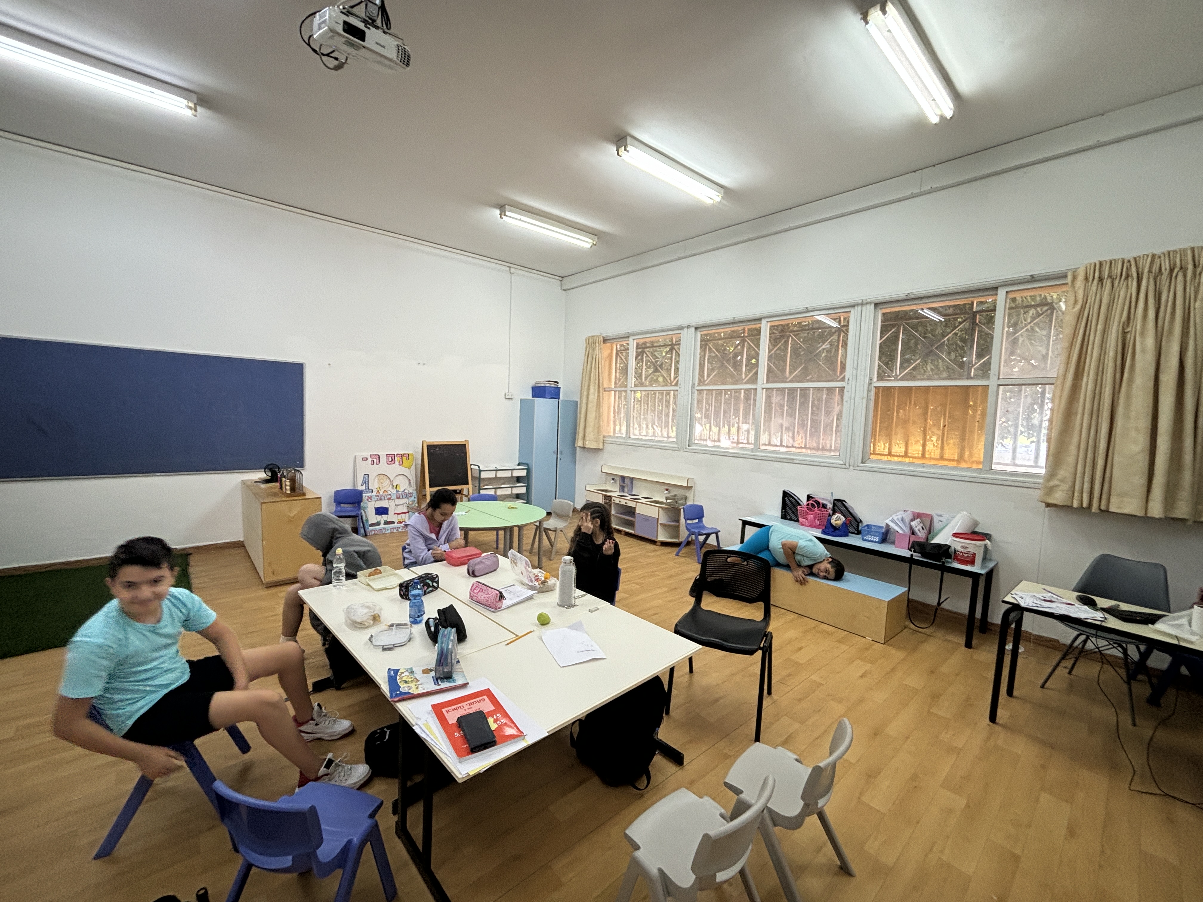 can you design a class for kids with nature texture table for 8 kids and reading area architecture