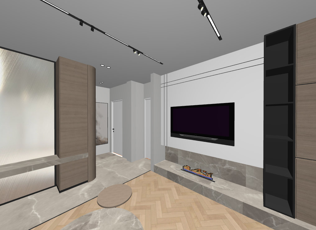 render put minimal items on the shelves and hidden lights and put a gas fire place under the tv