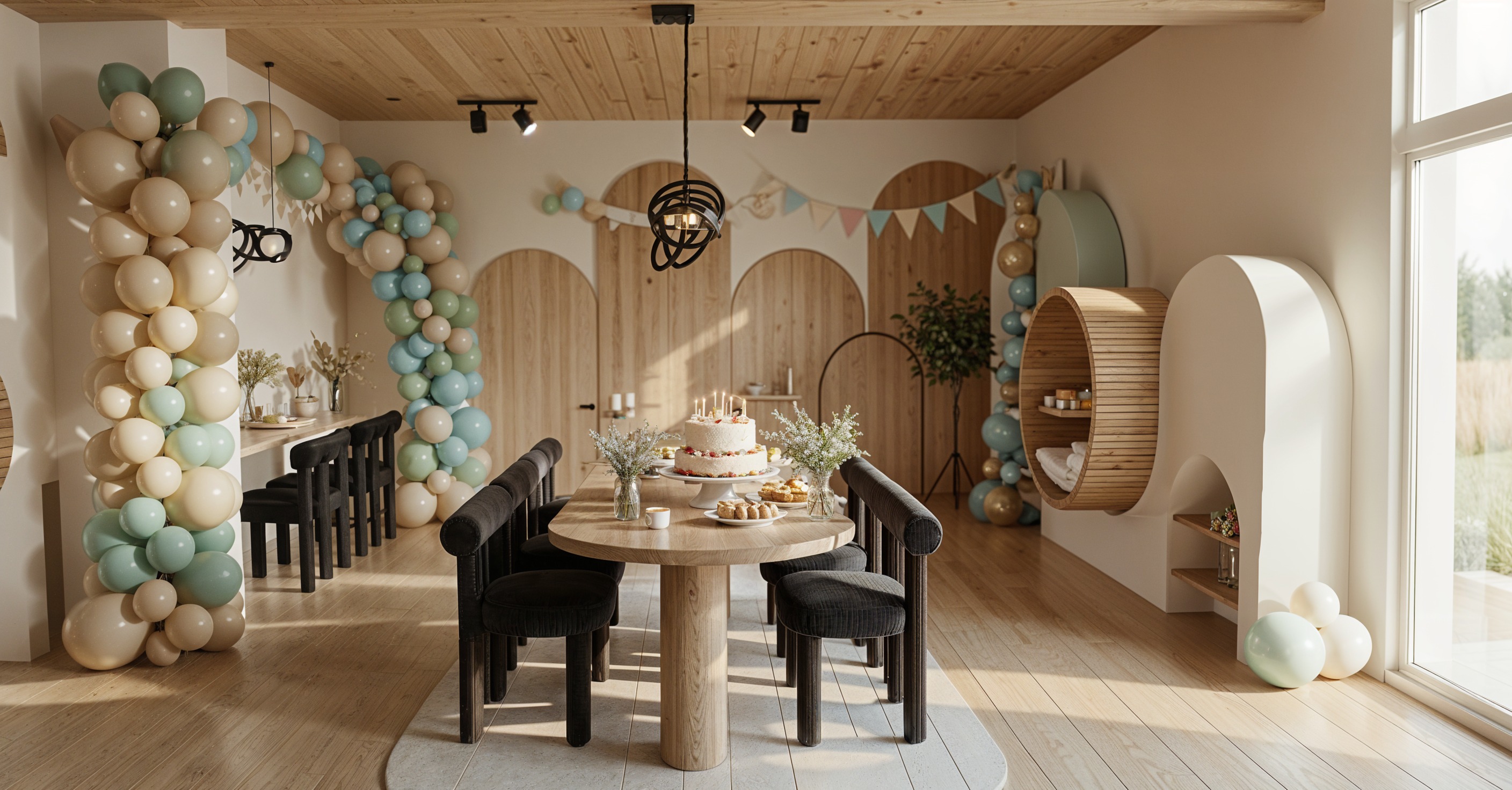 white chairs and ballons in center