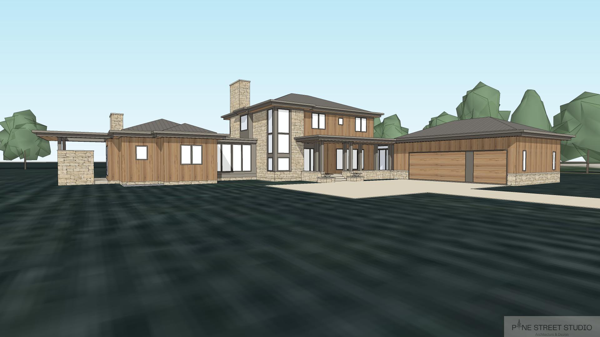 standing seam metal roof prairie grasses and lawn in the foreground open field in the background with a few trees some clouds in the sky and gentle sunlight on the front of the house