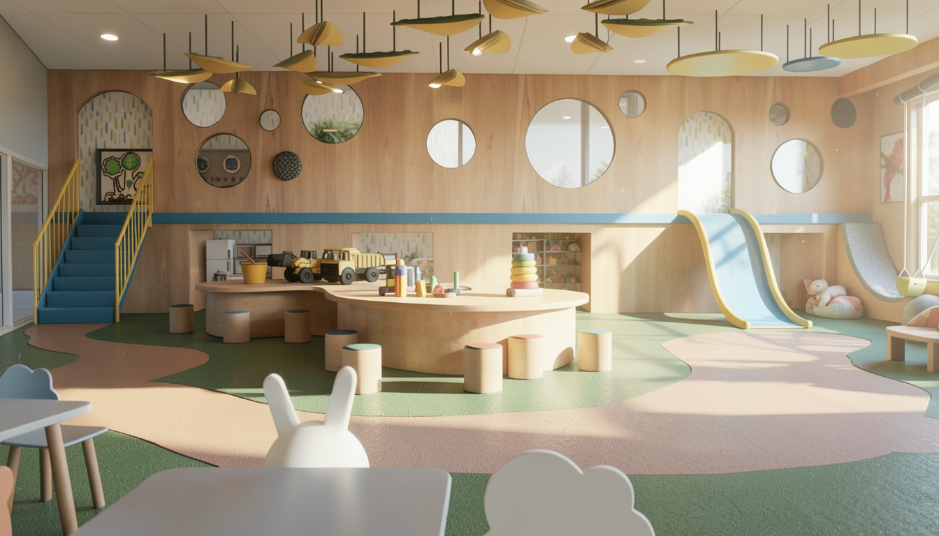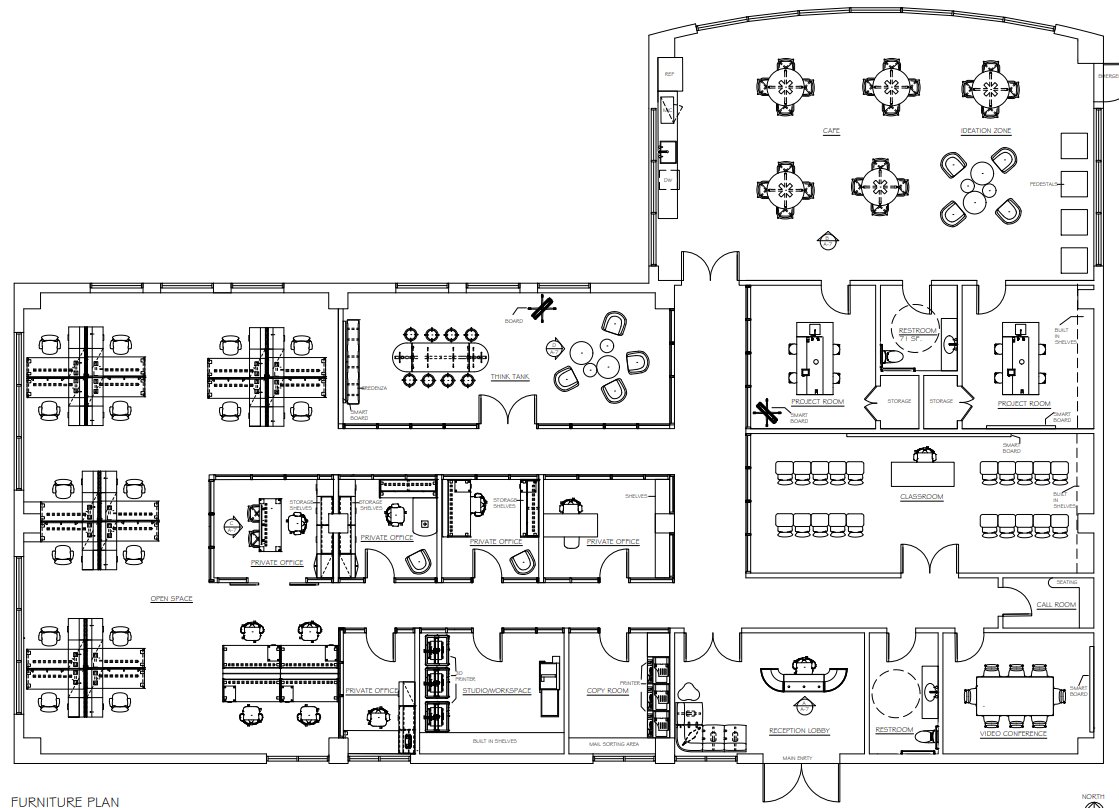 convert this floor plan into a realistic isometric 3d view of a full house show the space from an elevated angle with furniture walls and details visible corporate office keep the layout room locations and circulation exactly as shown in the plan style modern corporate office warm and inviting but still professional minimal clean slightly upscale no clutter color palette materials upholstery light green warm beige sage muted olive soft cream tones wood light natural oak for all desks tables shelving millwork accents chrome brushed metal no brass flooring continuous luxury vinyl flooring lvf in warm neutral tone throughout bathrooms darker porcelain stone tile spaces furniture reception lobby main entry clean modern reception desk in light wood large sectional sofa important low profile modern l shaped or slightly curved upholstered in beige or soft green small coffee table minimal d cor warm welcoming feel open office area bench style workstations in clusters light wood tops slim chrome legs ergonomic chairs in light green add monitors minimal desk accessories small plants private offices light wood desks beige guest chairs built in shelving storage clean and minimal styling studio workspace shared worktables in light wood mixed seating green beige functional collaborative environment storage and shelving along walls conference rooms large rectangular or oval light wood tables upholstered chairs green beige presentation screens or feature wall caf area curved space round caf tables with 4 chairs each light wood upholstered seating coffee kitchenette along wall casual relaxed atmosphere ideation lounge zone informal seating arrangement armchairs small tables add greenery flexible creative feel classroom rows of chairs facing instructor desk organized clean layout video conference room large central table executive style seating screen wall copy room support spaces printers counters storage functional but clean call room updated compact enclosed acoustic space built in curved booth seating important semi circular wrap around booth high upholstered back for privacy upholstery in green or beige small integrated light wood table soft slightly dim lighting cozy quiet private feel lighting recessed ceiling lighting throughout soft ambient lighting even illumination with slight warmth optional subtle accent lighting in lounge areas extra details add plants corners desks lounge areas minimal realistic accessories laptops notebooks mugs keep circulation paths clean and accurate render settings hyperrealistic soft shadows natural light balance warm tone overall camera isometric or slightly elevated perspective showing full layout clearly use the same furniture as shows on the plan do not change the orientation of the floorplan