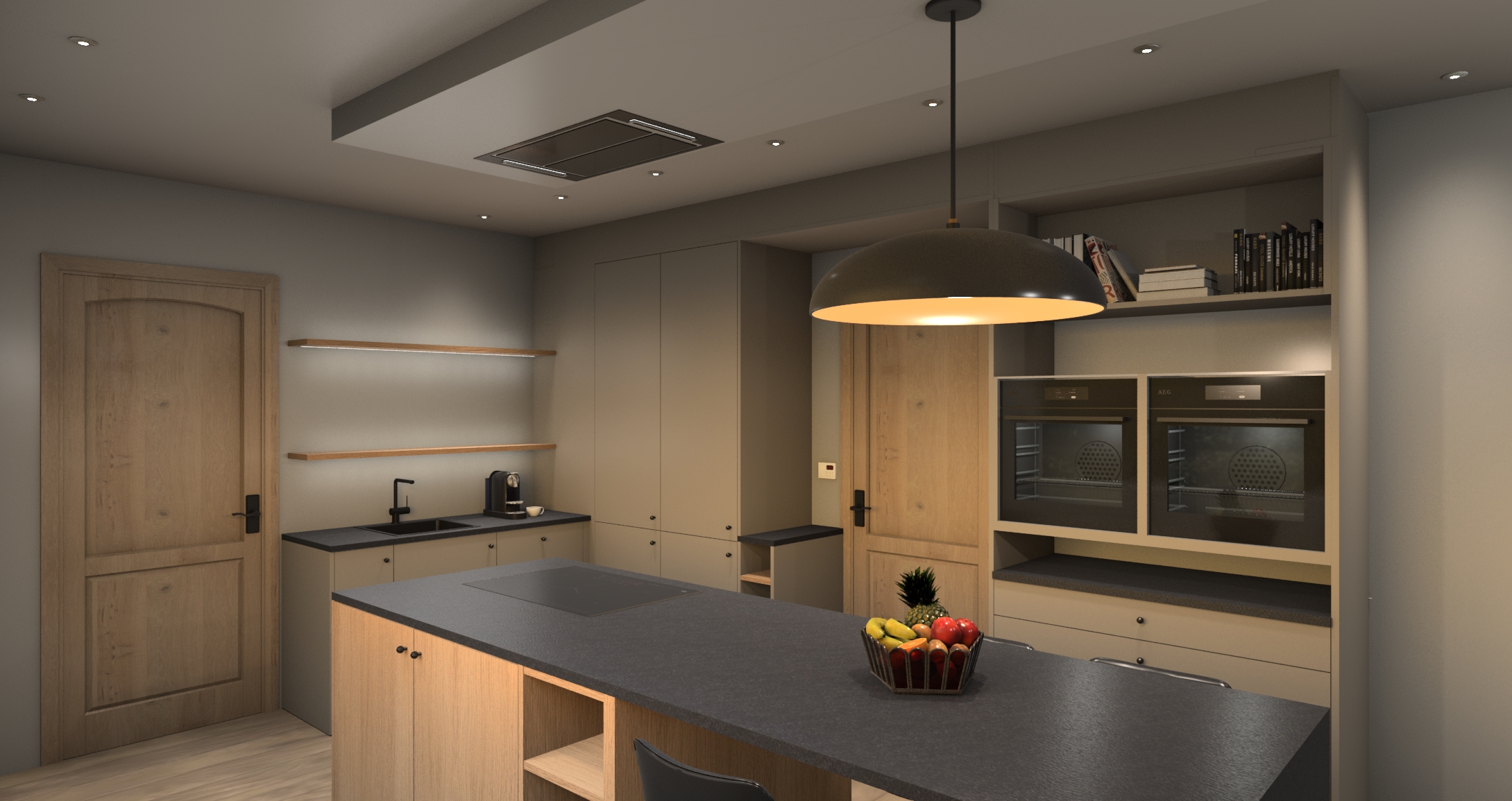 preserve all original decorations make them more realistic make the lighting slightly warmer and more realistic keep all original parts of the kitchen make it sharper and maintain the equiptment enchance the whole picture make it 4k quality add also some decoration on the shellfs