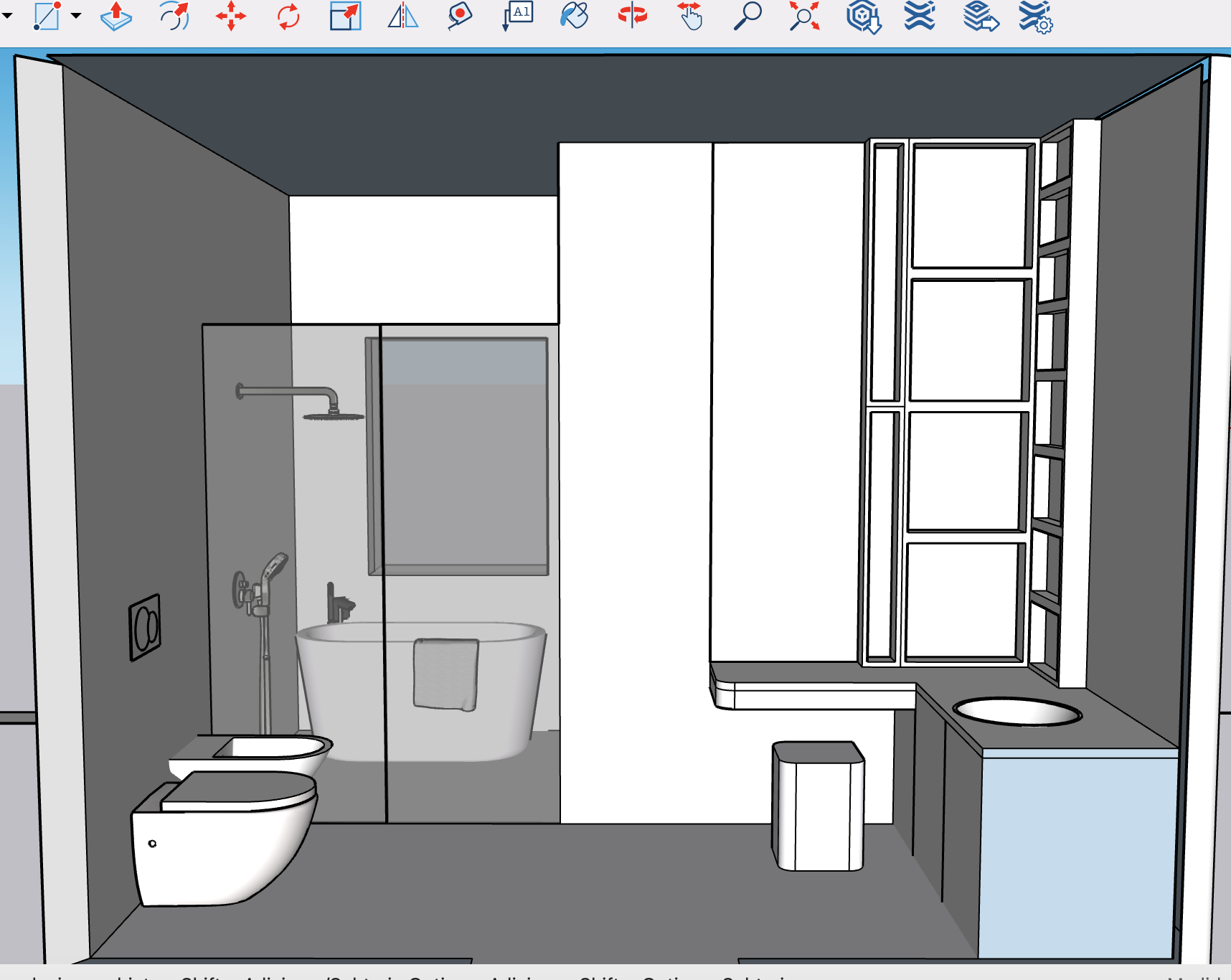 high end photorealistic interior render of a modern minimalist bathroom with japanese inspired design and warm natural atmosphere all walls fully clad in unpolished travertine marble soft beige tones natural porous texture matte finish continuous seamless surfaces matching unpolished travertine marble used for the vanity countertop and integrated sink area custom made bathroom vanity and dressing table in light natural oak wood with vertical slatted ribbed panels soft matte finish low saturation warm undertones clean and elegant design large wall mounted mirror with soft indirect led backlighting warm color temperature additional full height mirror panel integrated into the wall enhancing depth and brightness shower area with frameless clear glass enclosure ultra minimal profiles walk in shower design all metal fixtures in brushed stainless steel minimalist faucet shower mixer overhead rain shower handheld shower towel bars and accessories cohesive refined contemporary aesthetic soft indirect lighting integrated into ceiling and vanity warm ambient lighting calm and relaxing atmosphere natural daylight entering through a soft filtered window overall atmosphere serene elegant warm minimal spa like timeless high end architectural visualization ultra realistic materials soft shadows cinematic lighting global illumination 8k render quality professional interior photography style camera wide angle interior shot eye level view balanced composition deep depth of field focus on material textures and spatial harmony and put decor on the shelves