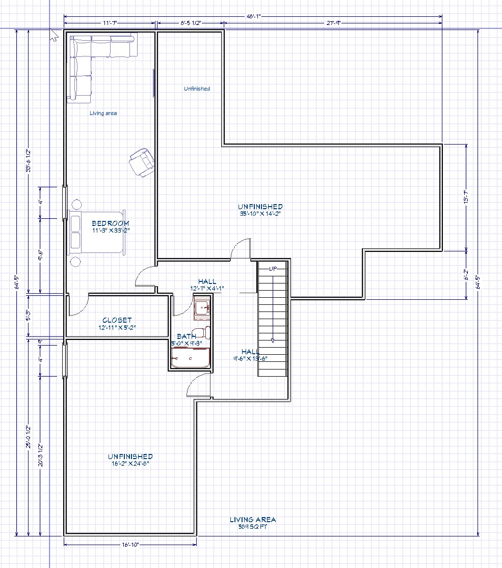 convert this floor plan into a realistic isometric 3d view of a full house show the space from an elevated angle with furniture walls and details visible render this basement bedroom and living room are attached do carpet in those areas the closet and all hallways in the two large unfinished spaces keep it concrete and studs the space immediately to the right of the living area is unfinished and is apart of the original unfinished space the only window is above the bed make it fun furniture and colors remove window above couch and add window behind bed use the same furniture as shows on the plan do not change the orientation of the floorplan
