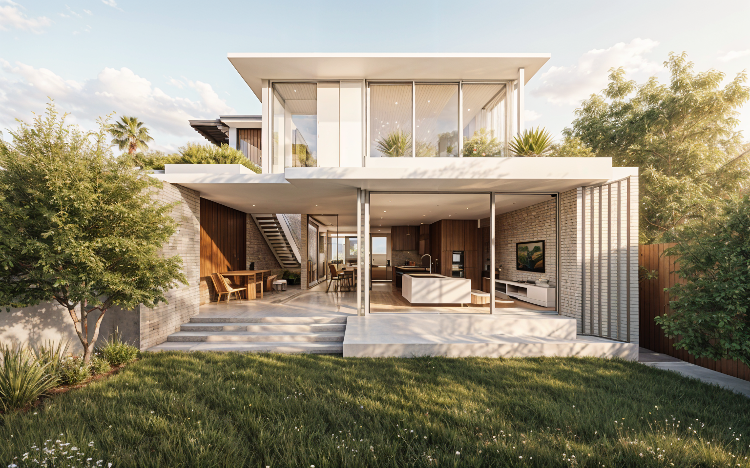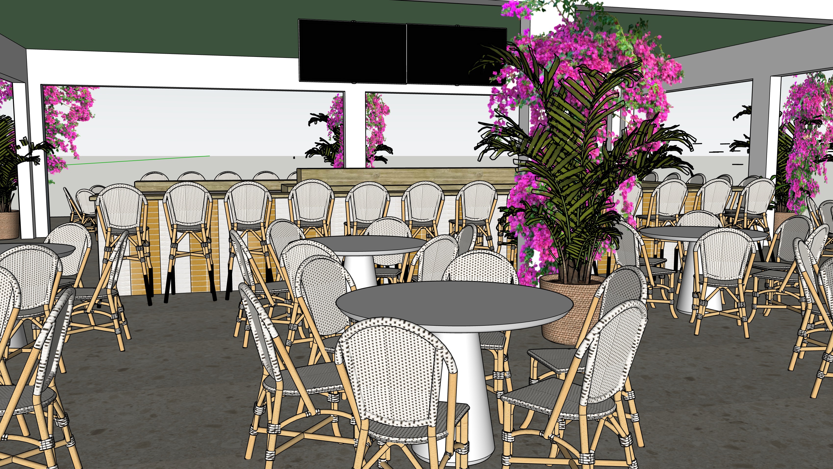 turn this view into a photo realistic rendering with dim led lighting under the bar area to highlight the yellow and white zellige tile also add street taco table settings to each table add bar bottles to the bar area as well background should be tropical greenery