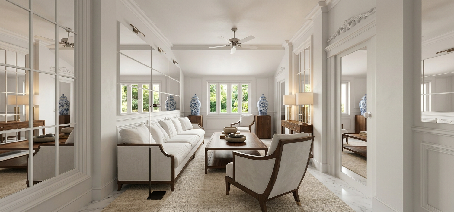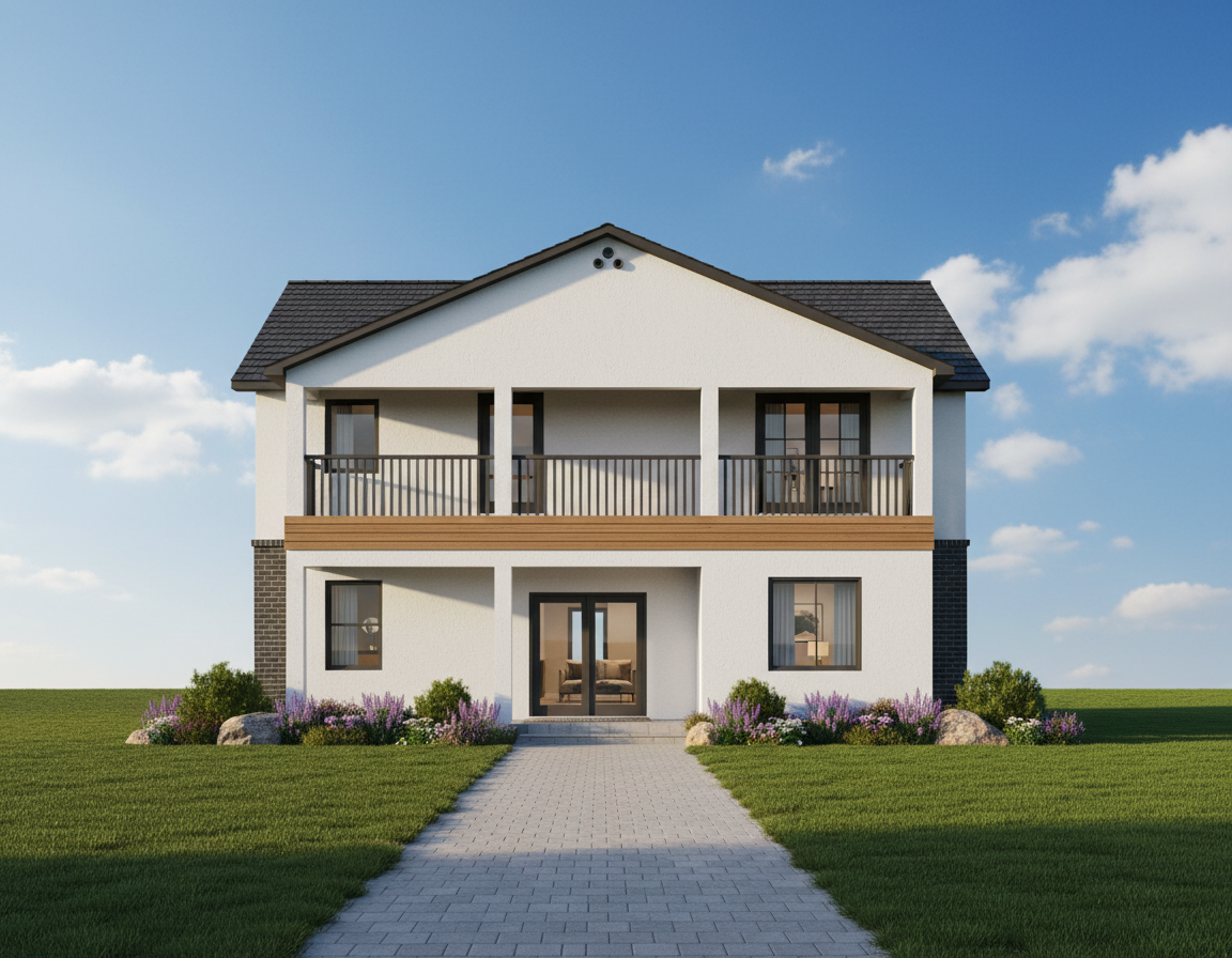 generate beautiful elevations renders with light inside with white stucco on front walls add person and kid on sencod floor