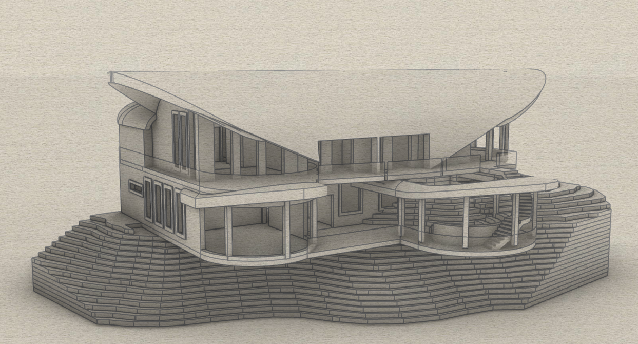 2 story research facility perched off a cliff sitting at a high elevation background filled with cloudy blue sky and mountains fog beneath it a mountain forest filled with trees behind the building black corrugated metal roof gray metal panel walls floor to ceiling glass framed with black steel warm light coming from the inside outdoor deck with amphitheater and curved roof above it railings along the balconies and deck