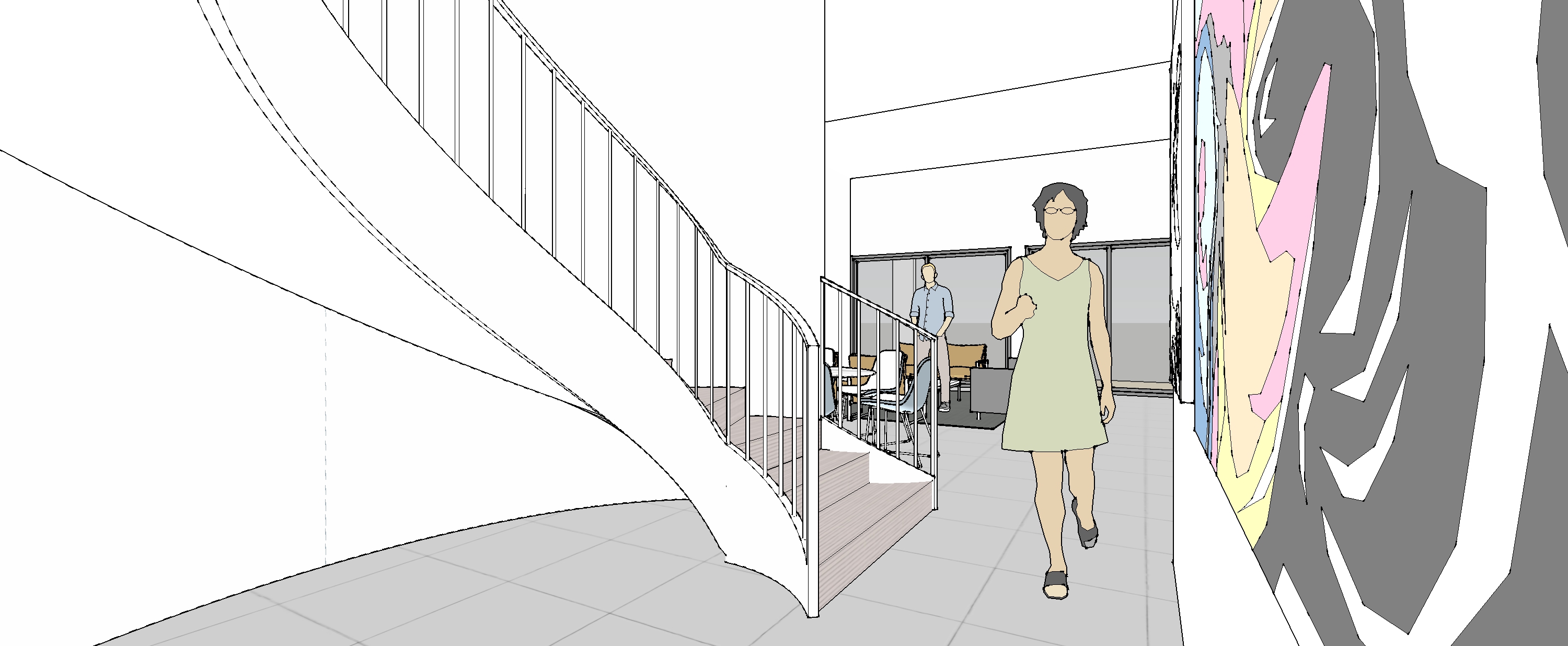 modern architectural home open airy ambience with natural light no cornices artwork to look painterly light grey coloured australian bluestone floor tile realistic carrara marble table top beige ribbed carpet on stair artwork to look painterly black aluminium doors and windows black steel handrail caramel coloured dining chairs