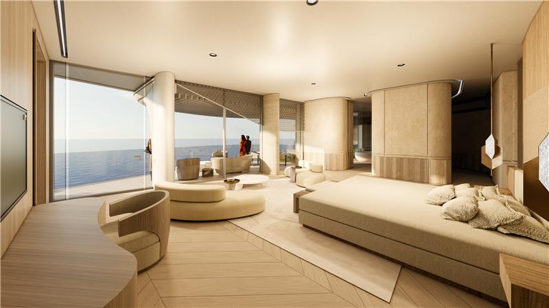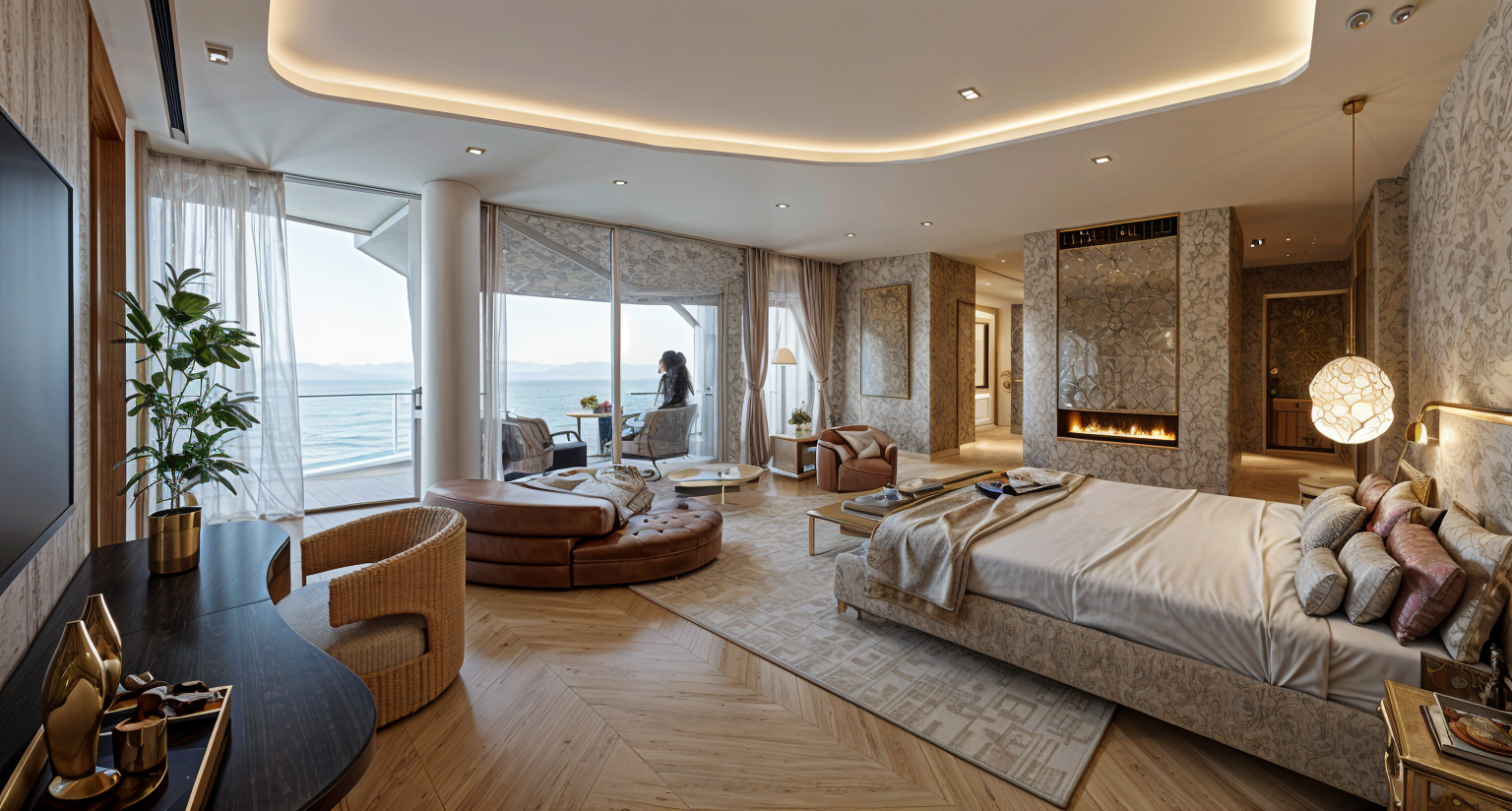 modern contemporary bedroom with a lush master bed and lighting curtains and view out to the sea fluted travertine walls and a fireplace within the wall do not change entry and exit composition