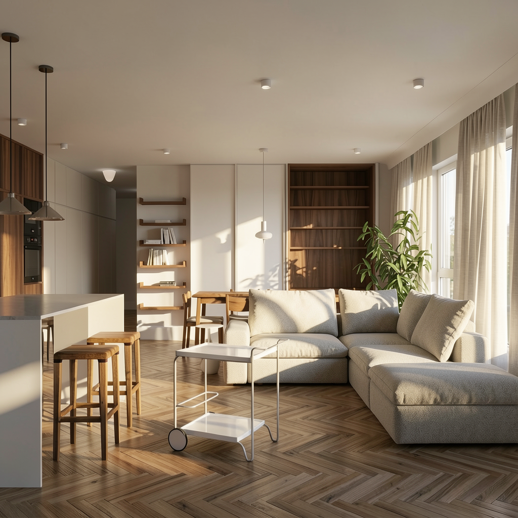use the provided render as the base lock geometry lock camera lock all material positions no material may appear on any surface other than where explicitly assigned below lower upper cabinetry fronts only warm greige lacquer mid grey beige sophisticated not cold ultra matte soft touch on door and drawer fronts only tall full height panels only dark walnut deep warm brown bold grain matte oiled panels only do not bleed onto cabinet fronts or island range hood exterior only same warm greige lacquer as cabinetry fully integrated tonal match hood surface only island waterfall all countertops only cosentino clos ivora light elegant mineral surface subtle veining polished inlayr 3d depth on horizontal tops and island waterfall sides only do not apply stone to any vertical cabinet surface backsplash wall only full height clos ivora slab seamless from countertop to base of upper cabinets only continuous no grout lines do not extend to ceiling ceiling bright greige warm light slightly tonal with cabinetry but much lighter do not drench ceiling dark floor keep existing floor do not change lighting bright cool warm balanced showroom daylight from across the kitchen crisp professional lifted ambient no shadows crushing detail tonal warm luxury kitchen ultra photorealistic showroom refined editorial interior architecture strength 75 seed 7338 keep the existing geometry for the existing handles in the model keep them wood like the doors