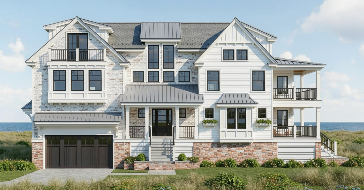 white siding black window house with a modern rustic aesthetic light red brown bricks for foundation under the siding