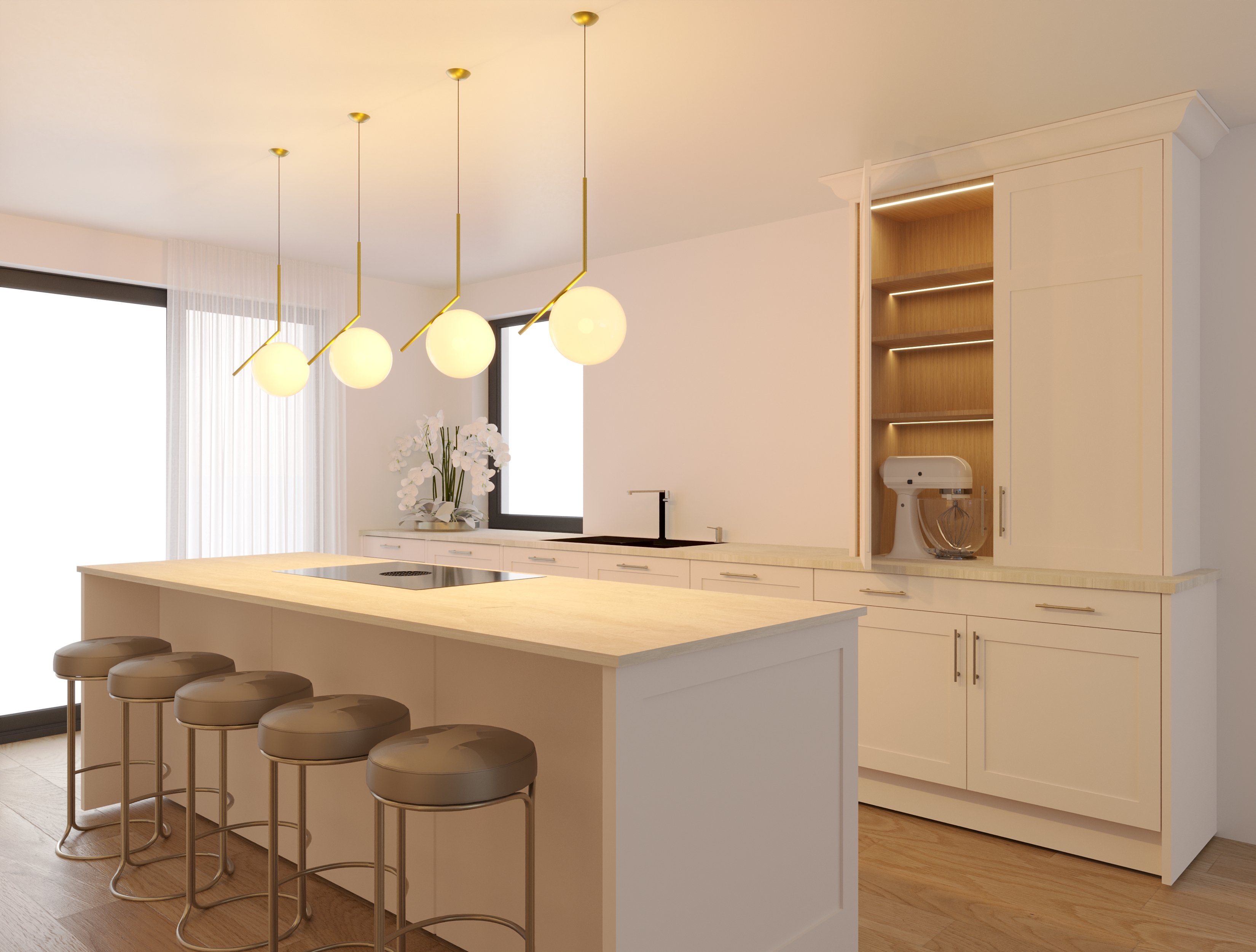 improve the lighting add decor on breakfast bar like coffee and a book add limewash finish onto walls add background behind the windows