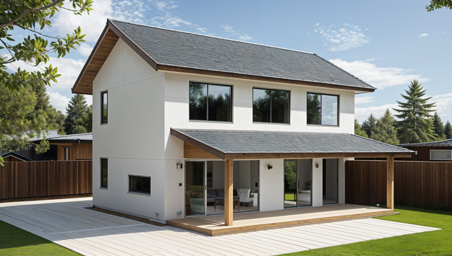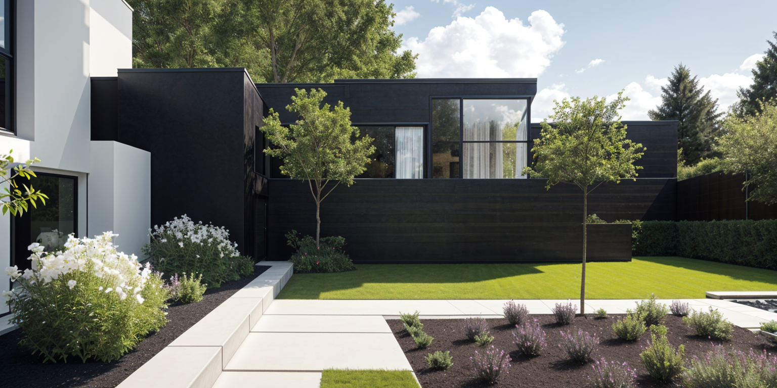 bobby mcalpine exterior shot a two story modern house with a rough textured beige stucco fa ade pebble dash style the windows are framed with clean smooth plaster borders in a slightly lighter tone creating a contrast each window features a black metal railing in front and the edges of the plaster frames are crisp and rectangular forming a minimalist architectural detail warm afternoon light casts soft shadows on the fa ade in an english back jard architecture