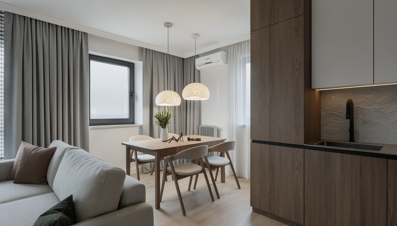 illumination in the interior as on a cloudy day transform the input interior design photo into a hyper realistic architectural visualization of a contemporary modern interior preserve exact geometry layout proportions and material intent from the original design lighting create soft overcast daylight atmosphere similar to a cloudy rainy day without visible rain with diffused natural light entering through windows subtle ambient glow to enhance depth and spatial layering maintain balanced contrast no harsh shadows no overexposure materials textures enhance material realism micro details surface imperfections soft reflections accurate roughness physically correct light response emphasize textures wood grain fabric weave stone concrete metal and matte finishes high micro contrast and tactile depth rendering style ultra photorealistic architectural visualization cinematic quality natural color grading neutral tones soft highlights realistic global illumination physically based rendering high dynamic range premium interior photography style camera composition wide angle architectural lens natural perspective eye level viewpoint deep focus sharp details across the frame natural framing no distortion atmosphere calm elegant contemporary premium residential mood clean minimal refined without visual noise output 8k resolution ultra detailed noise free crisp edges professional architectural rendering quality negative prompts no rain droplets no lens flares no fog no haze no bloom no motion blur no cartoon no stylization no oversharpening no artificial glow no unrealistic reflections no distortion no clutter pod klimatyzacj jest bia y grzejnik sofa jest bez obram wki materia u po lewej stronie jest bia e w skie pojedyncze okno z parapetem za firank nad sto em s chropowate lampy o delikatnej strukturze bia ego baranka
