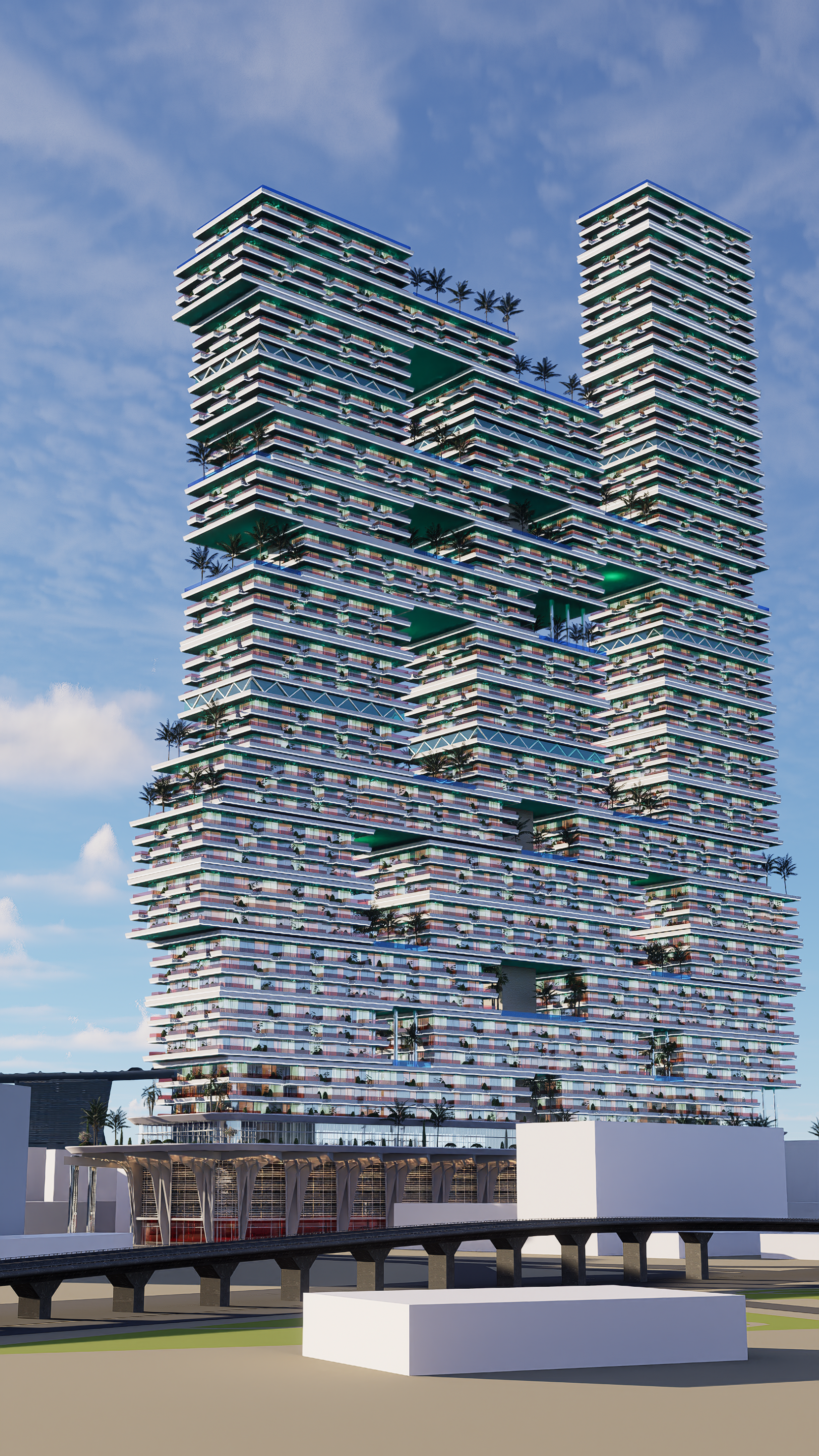 a cinematic architectural visualization of a luxurious skyscraper rising above a vibrant modern city context surrounding buildings are 5 6 stories high creating strong contrast that emphasizes the tower as an elegant landmark the scene integrates lush urban greenery with trees and landscaped plazas blending natural and urban atmospheres the render should capture a high quality cinematic mood with dramatic lighting photorealistic textures and professional architectural detailing add realistic people interacting in the space to show scale and liveliness like an architectural hero shot the composition should highlight the skyscraper as a refined iconic centerpiece of the city skyline standing tall with premium materials and refined design lines