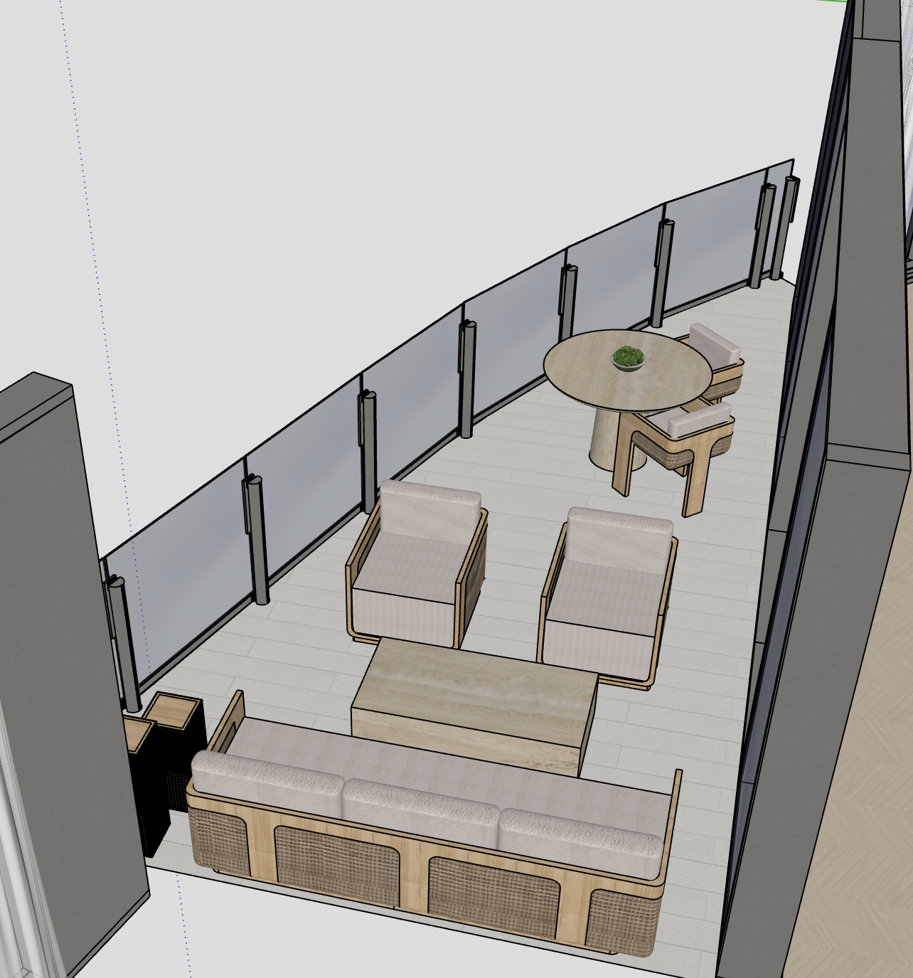 in the first image is a screenshot from sketchup of my terrace with added furniture create a rendering using pictures from the terrace