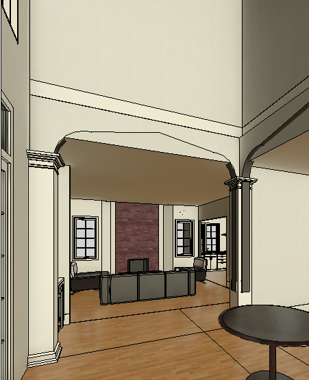 realistic image white painted panel upper walls add rug under furniture add decorative mantel with colorful painting above add fire in fireplace sunset light coming from left side windows remove keystone above arch move rug centered under round table remove doors in background and add kitchen lower cabinets with white counter top