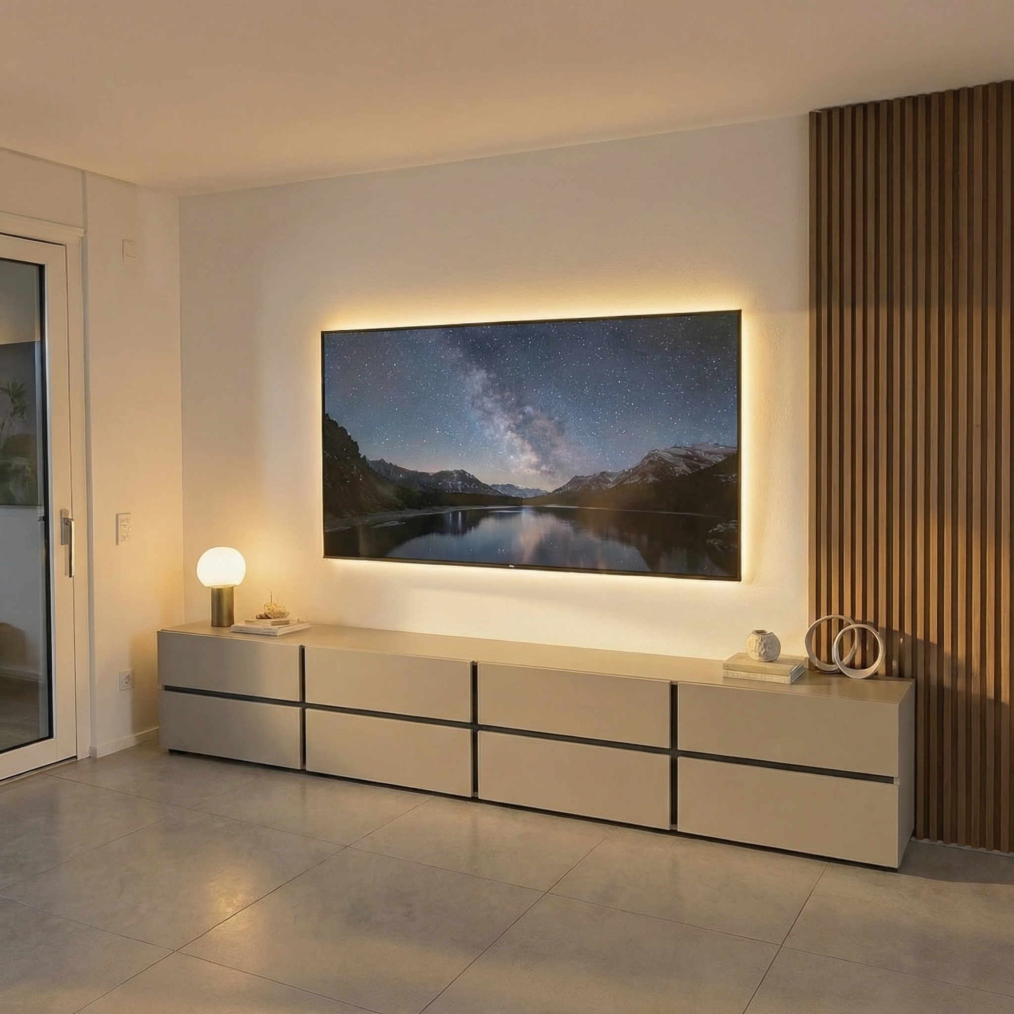 add more wood stripes like the existing once also behind the tv