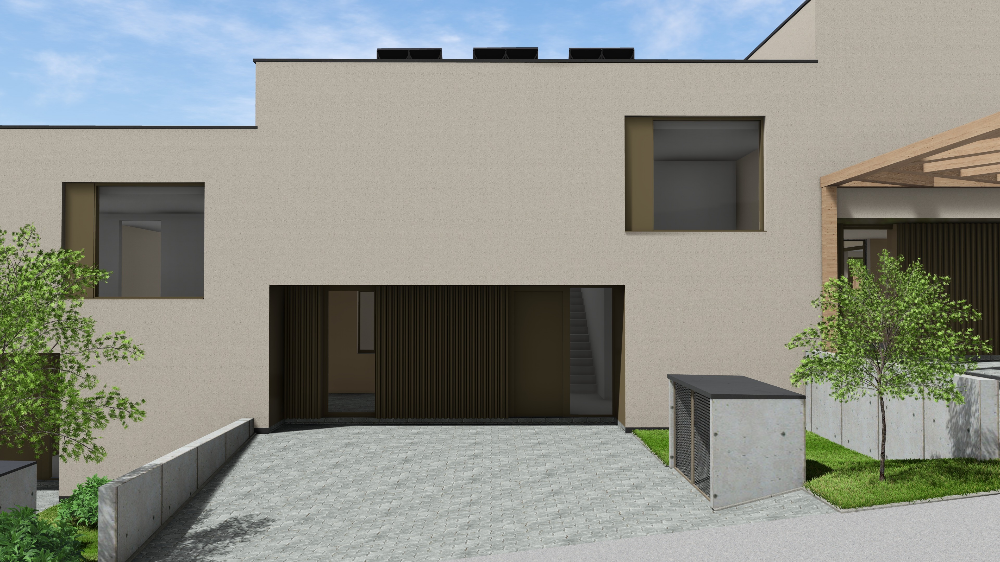 a photorealistic architectural photographbased on the input image showing the building exterior under warm golden afternoon sun the existing facade materials colors and architectural details including window frames and cladding must strictly retain their exact shades and appearance from the source image large windows are slightly ajar or transparent revealing glimpses of a modern warmly lit furnished interior to add depth and life the surroundings feature lush high quality landscaping the grass is detailed showing individual blades and trees or plants have vibrant realistic textures day sunlight realistic shadows highlighting material textures cinematic atmosphere highly detailed