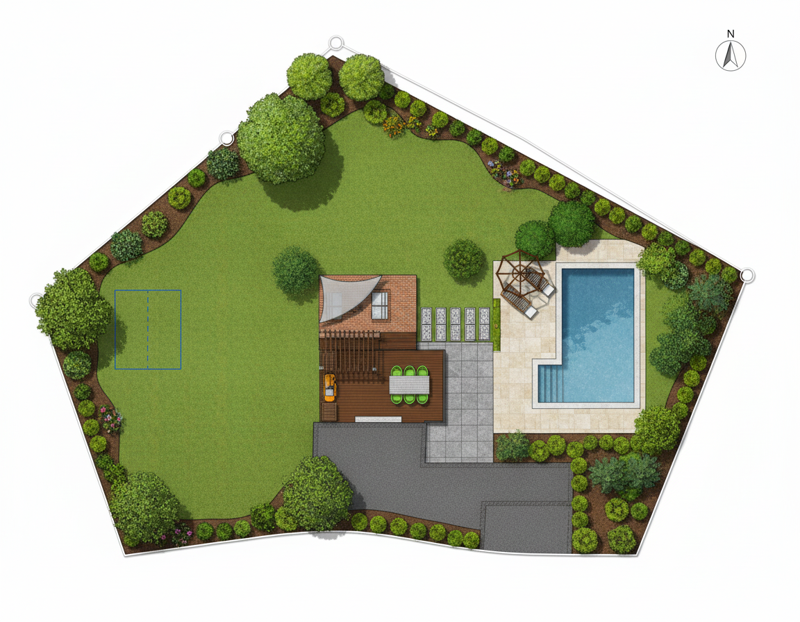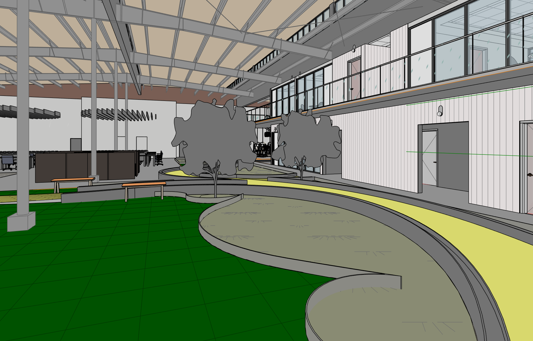 make this look realistic but keep everything the same make the curved yellow path a boardwalk with a concrete planter on either side full of plants the 2x2 square flooring is to be a green carpet the ceiling is not skylights keep the view the same any floor that is grey should be concrete