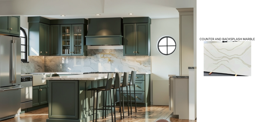 replace the countertop and backsplash marble with a warm white marble slab that has soft flowing beige and taupe veins similar to calacatta gold marble the background color should be creamy white not bright white or gray the veining should be wide organic and flowing horizontally across the backsplash and waterfall island continue the same slab pattern from the countertop up the backsplash for a full slab backsplash look the finish should be polished marble with subtle reflection