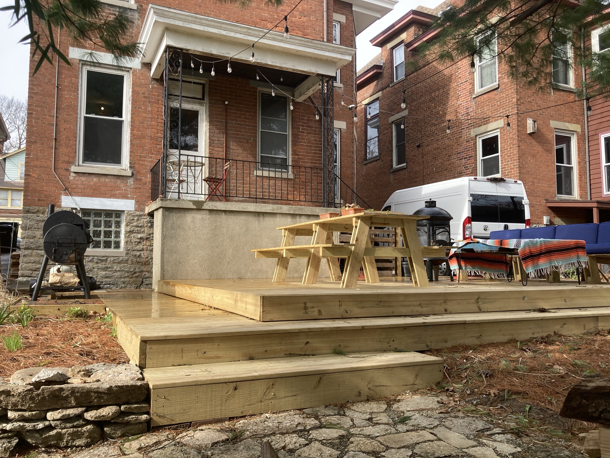 edit these photos to make them look like professional landscape architecture photos of a back yard deck design project make them ethereal and beutiful but keep the design to show off my work add a few people remove van and add planting in planting beds blur context to highlight the design