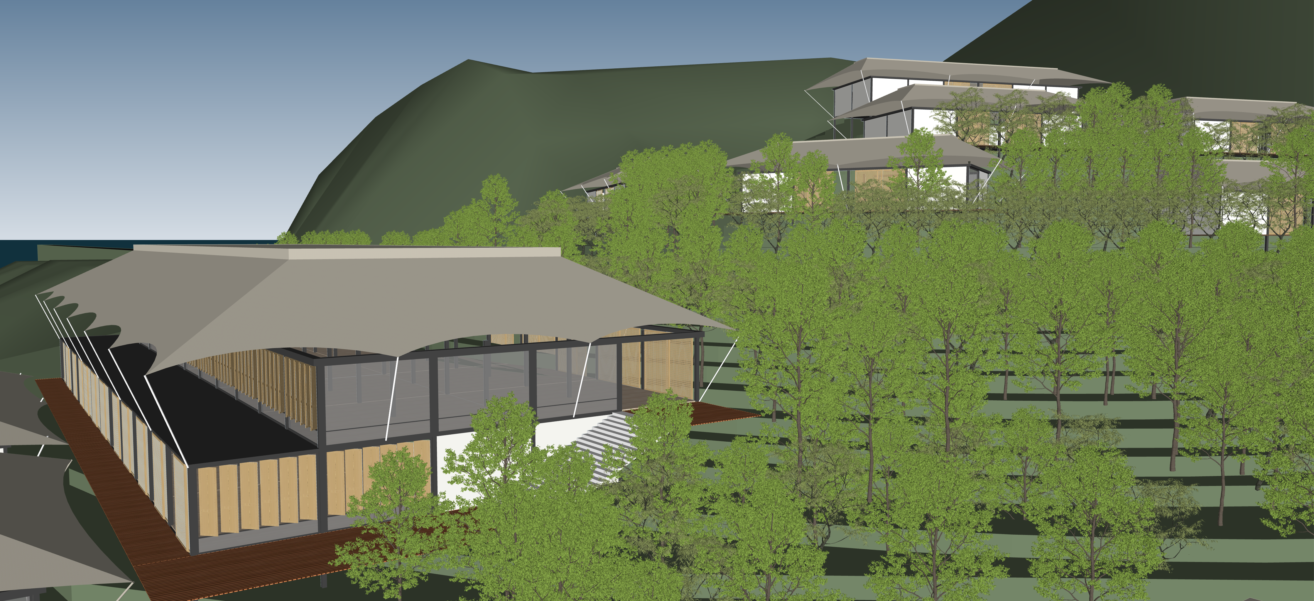 archsynth render based strictly on the exact angle and composition of the provided 3d drawing preserve all geometry and arrangement enhance material realism of the tent building light brown fabric roof wood structure stilt foundation and minimalist japanese inspired lines add dense forest vegetation on the hill behind without altering the original view keep the labuan bajo coastal atmosphere