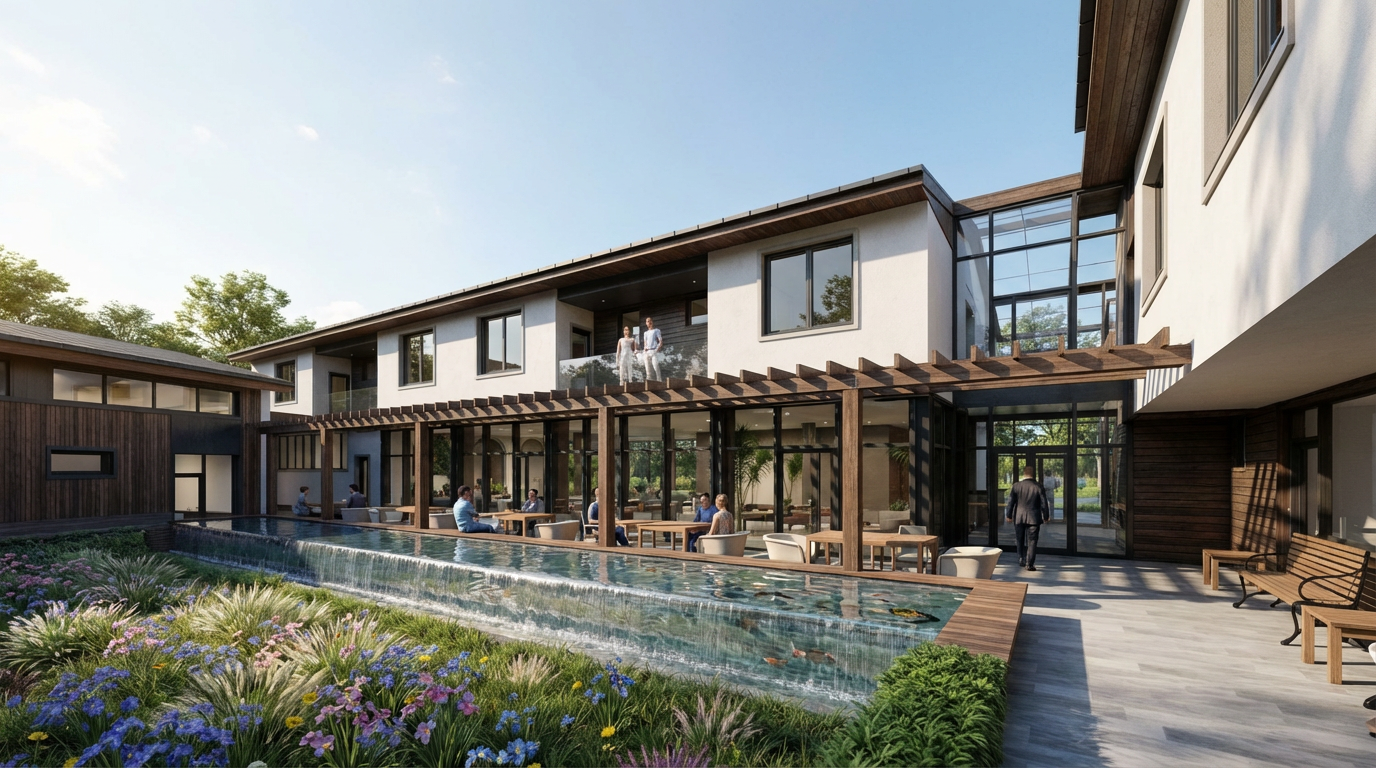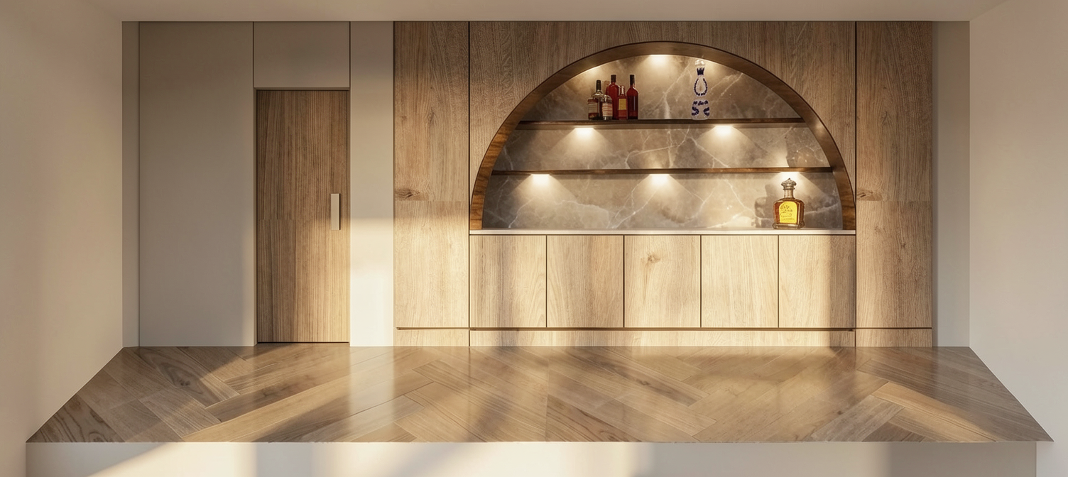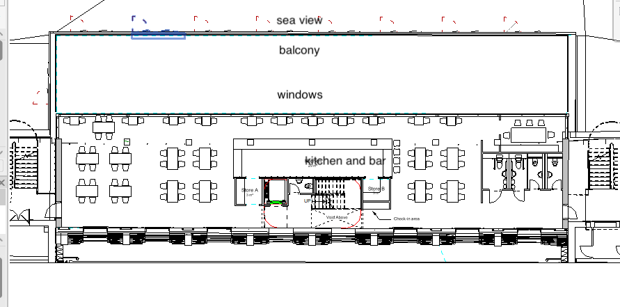 art deco wide angle shot transform the provided architectural drawings into a high end photorealistic render while strictly preserving the original geometry layout proportions circulation wall positions bar shape stair placement terrace alignment and all furniture locations exactly as designed without any redesign or alteration and compose the scene to capture the entire restaurant space from a slightly elevated eye level perspective with a wide angle lens approximately 24 28mm clearly showing the interior dining area central bar and open kitchen full height glazing fa ade terrace connection and uninterrupted sea view on the horizon set the scene during golden hour at sunset with warm natural light entering through the sea facing windows casting long soft shadows creating gentle golden highlights subtle reflections on glass and polished surfaces and a sky gradient transitioning from warm orange to soft pink and pale blue establishing a relaxed upscale coastal atmosphere with cinematic warmth enhance the architectural materials while maintaining all original forms by introducing rich walnut or dark wood grain with fine detail polished marble surfaces with subtle veining and soft reflections warm brass accents ribbed and fluted glass textures and expansive glazing that reflects the sunset while maintaining clarity toward the ocean keep the bar exactly as designed and aligned with approximately one quarter of its length dedicated to shelving that remains structurally unchanged but filled with evenly arranged wine bottles and premium spirits enhanced by warm integrated accent lighting and ensure the wall behind these shelves is a deep golden amber ribbed glass with a textured surface and strong warm backlighting that highlights bottle silhouettes while the remaining portion of the bar functions as a refined open kitchen with two chefs preparing food in a clean minimal high end environment and include two bartenders behind the bar naturally interacting and preparing drinks retain all tables and chairs in their exact positions while upgrading them with premium table settings including wine glasses champagne flutes elegant plates polished cutlery cloth napkins and a selection of stylish cocktails and introduce mid aged guests between 30 and 55 years old dressed in relaxed upscale attire naturally socializing dining and drinking ensuring they are correctly scaled tastefully integrated and do not obstruct architectural visibility or overcrowd the space show the terrace populated lightly with guests and seamlessly connected to the interior reinforcing the indoor outdoor flow with the ocean clearly visible beyond and suggest a gentle coastal ambiance through subtle movement and atmospheric softness render the scene in ultra high realism with high dynamic range lighting soft shadows refined contrast and enhanced material richness including detailed wood grain marble sheen brass highlights fabric textures and crisp glass reflections while maintaining clear depth from foreground to background with a very subtle cinematic depth of field and ensure the overall mood conveys luxury coastal dining with art deco elegance timeless character and calm refined social energy avoiding any redesign overcrowding excessive stylization futuristic elements dark lighting or visual clutter architecture