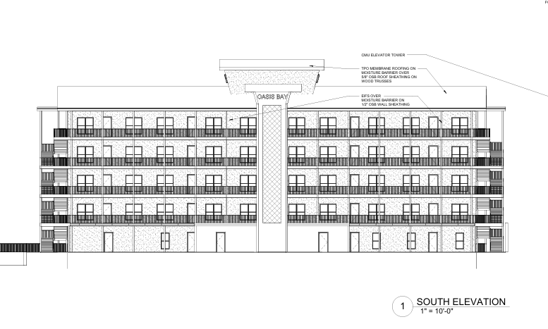 the elevator tower is extruded outward from the main building and is located in the center of the building and is accessed from sidewalks that enter from the east and west in front of the building