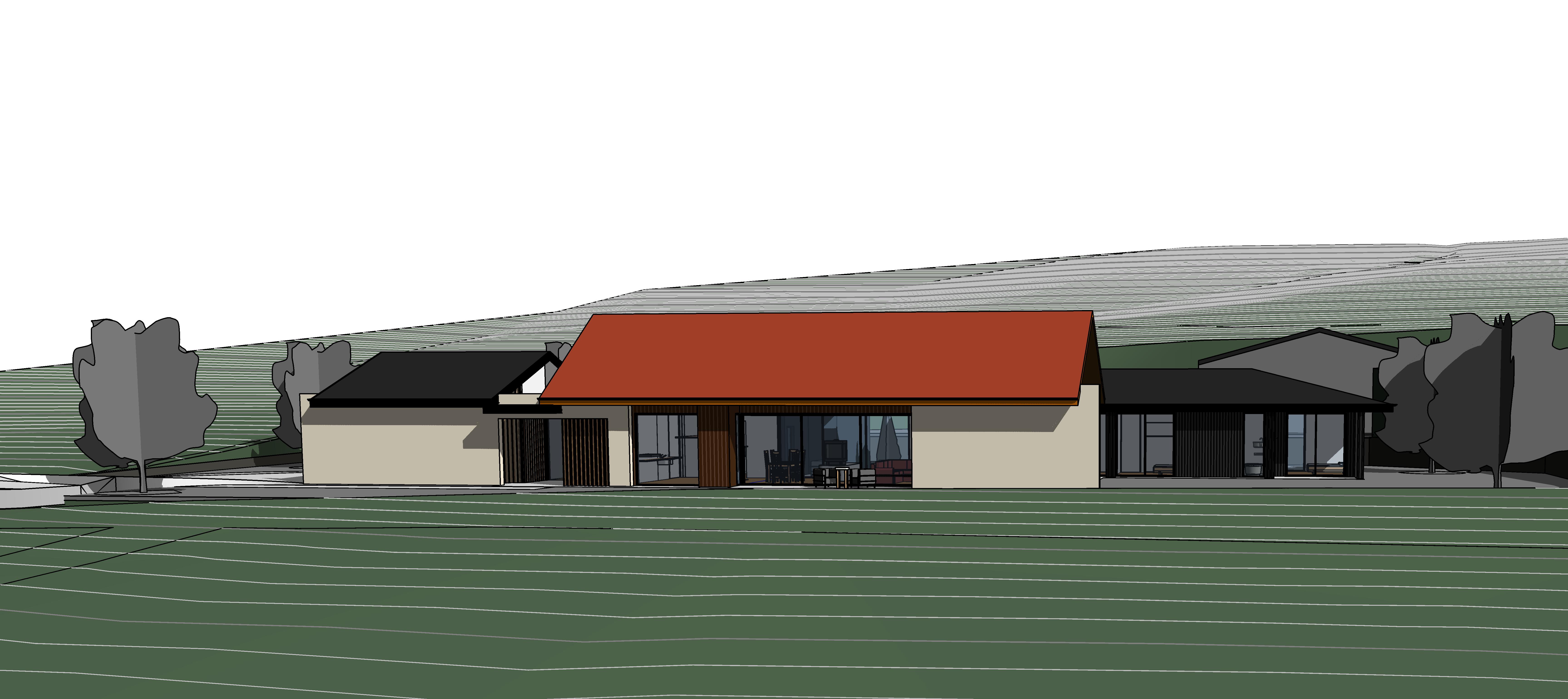 orange is corten roof and cladding sunny day minimal cloud black roof and cladding secondary buildings off white brick spin wall front of corten dwelling