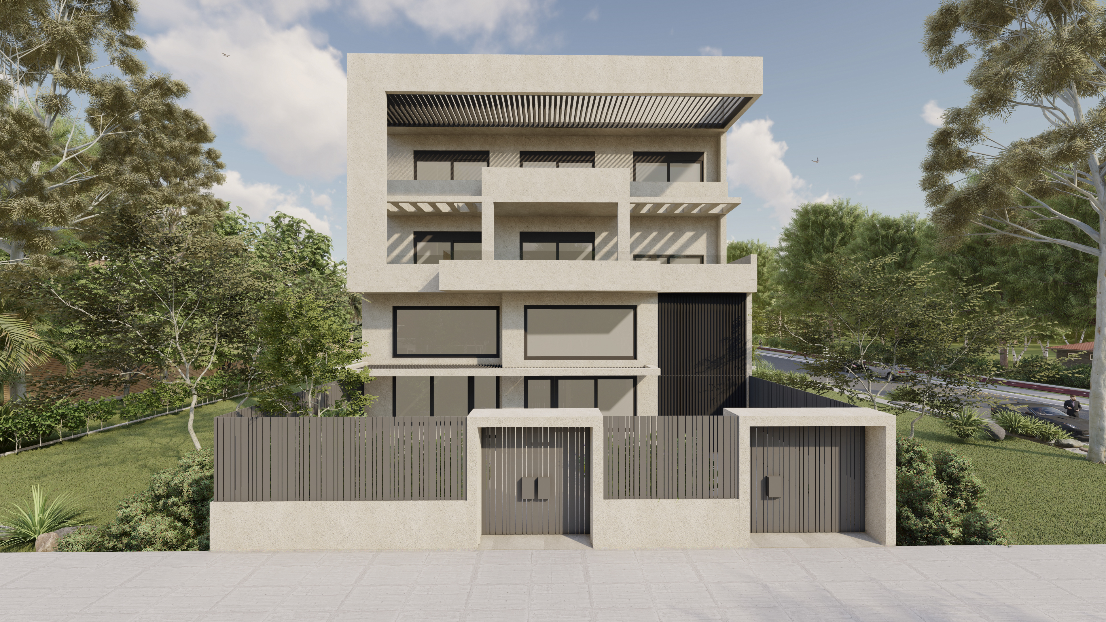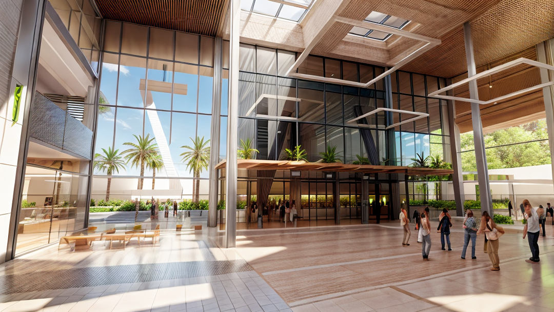 daylight and warm bronze metal elements and warm cement mortat in the walls