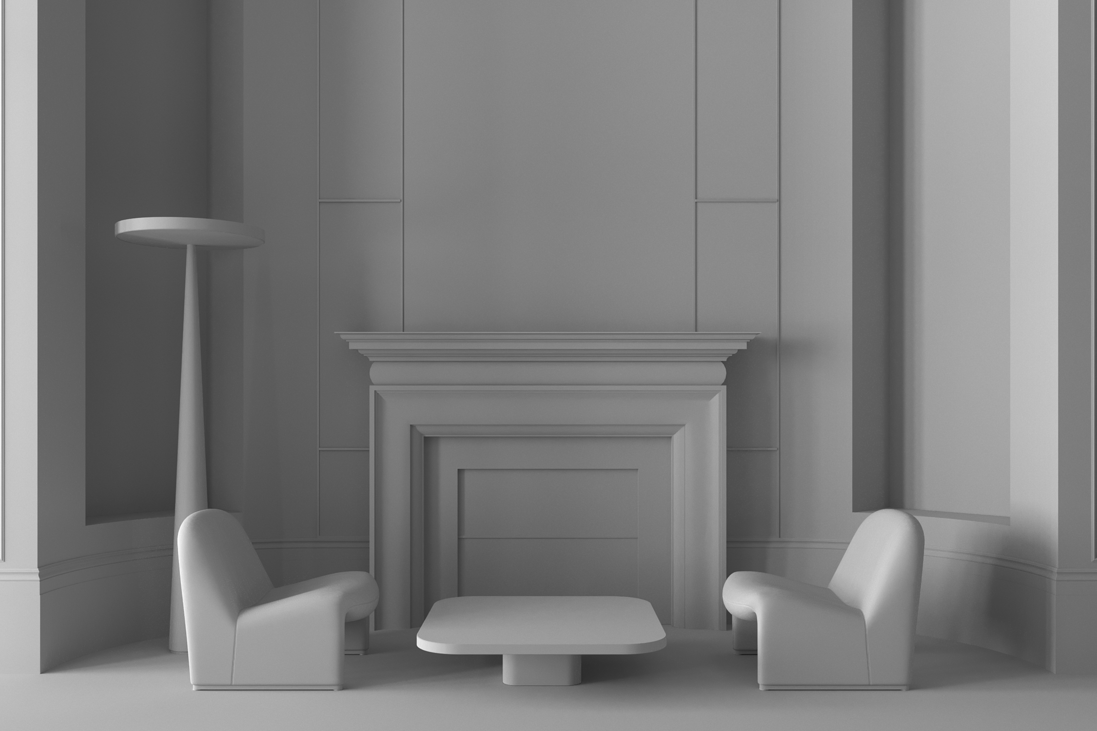 create a highly realistic image and maintain the wall geometry add soft lighting marble and tavertine material with a cozy fireplace