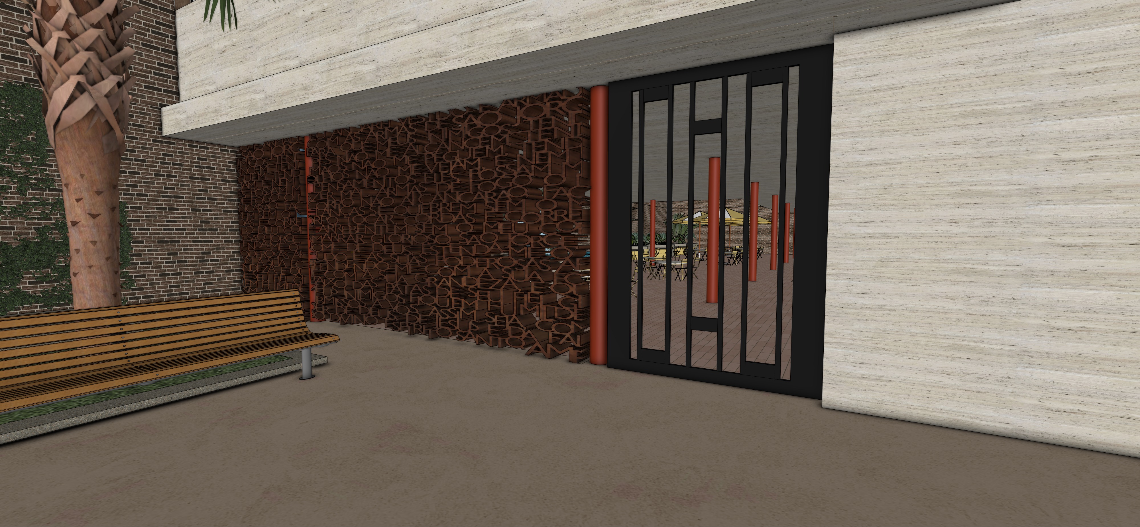 create a photorealistic architectural render based strictly on the provided sketchup image absolutely do not modify architecture geometry camera position composition materials colors objects placement of elements the scene must remain exactly as modeled in the sketchup image important architecture rules the black metal entrance door must not contain glass the door must remain an open metal frame structure with empty spaces between the vertical bars do not add glass or reflections to the door material preservation travertine wall must remain light beige travertine with horizontal texture the perforated corten steel screen must remain corten steel with rusty orange tones the cylindrical columns must remain warm reddish tones the door frame must remain matte black metal lighting bright sunny daytime lighting clear daylight with soft natural shadows warm sunlight entering from the exterior courtyard natural architectural daylight no sunset colors environment maintain the courtyard visible through the entrance exactly as modeled do not add sky where walls exist do not add trees furniture or people rendering style high end architectural visualization photorealistic materials soft realistic shadows and daylight reflections do not redesign the scene preserve the sketchup model exactly